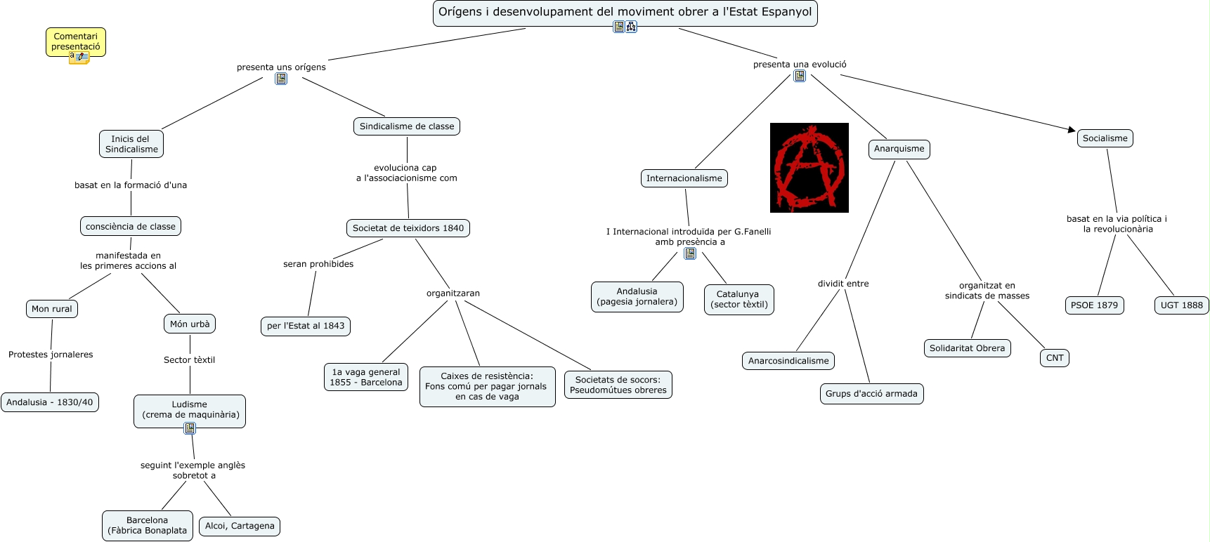 Aquest mapa conceptual conté informació relacionada amb: Orígens i desenvolupament del moviment obrer espanyol (Amb presentació - Activitat 5), Món urbà Sector tèxtil Ludisme (crema de maquinària), Orígens i desenvolupament del moviment obrer a l'Estat Espanyol presenta uns orígens Inicis del Sindicalisme, Anarquisme dividit entre Grups d'acció armada, Internacionalisme I Internacional introduïda per G.Fanelli amb presència a Catalunya (sector tèxtil), Societat de teixidors 1840 organitzaran 1a vaga general 1855 - Barcelona, Orígens i desenvolupament del moviment obrer a l'Estat Espanyol presenta una evolució Socialisme, Anarquisme organitzat en sindicats de masses CNT, Orígens i desenvolupament del moviment obrer a l'Estat Espanyol presenta una evolució Internacionalisme, consciència de classe manifestada en les primeres accions al Món urbà, Orígens i desenvolupament del moviment obrer a l'Estat Espanyol presenta una evolució Anarquisme, Anarquisme organitzat en sindicats de masses Solidaritat Obrera, Mon rural Protestes jornaleres Andalusia - 1830/40, Socialisme basat en la via política i la revolucionària UGT 1888, Orígens i desenvolupament del moviment obrer a l'Estat Espanyol presenta uns orígens Sindicalisme de classe, Inicis del Sindicalisme basat en la formació d'una consciència de classe, Societat de teixidors 1840 seran prohibides per l'Estat al 1843, consciència de classe manifestada en les primeres accions al Mon rural, Sindicalisme de classe evoluciona cap a l'associacionisme com Societat de teixidors 1840, Anarquisme dividit entre Anarcosindicalisme, Societat de teixidors 1840 organitzaran Societats de socors: Pseudomútues obreres