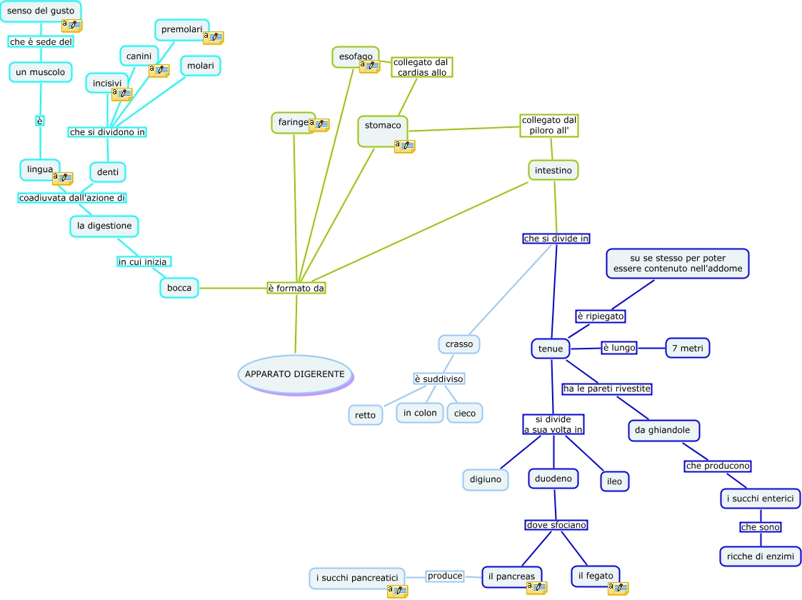 Questa Cmap, creata con IHMC CmapTools, contiene informazioni relative a: apparato digerente, stomaco collegato dal piloro all' intestino, APPARATO DIGERENTE è formato da esofago, tenue si divide a sua volta in digiuno, bocca in cui inizia la digestione, APPARATO DIGERENTE è formato da intestino, tenue si divide a sua volta in duodeno, intestino che si divide in tenue, denti che si dividono in molari, tenue si divide a sua volta in ileo, APPARATO DIGERENTE è formato da bocca, crasso è suddiviso in colon, esofago collegato dal cardias allo stomaco, un muscolo che è sede del senso del gusto, tenue è ripiegato su se stesso per poter essere contenuto nell'addome, i succhi enterici che sono ricche di enzimi, la digestione coadiuvata dall'azione di denti, da ghiandole che producono i succhi enterici, denti che si dividono in premolari, il pancreas produce i succhi pancreatici, duodeno dove sfociano il pancreas