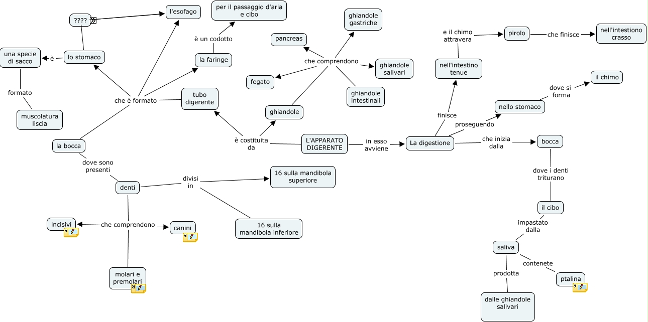 Questa Cmap, creata con IHMC CmapTools, contiene informazioni relative a: La digestione, saliva contenete ptalina, L'APPARATO DIGERENTE è costituita da ghiandole, L'APPARATO DIGERENTE in esso avviene La digestione, ghiandole che comprendono pancreas, denti che comprendono molari e premolari, ghiandole che comprendono fegato, la bocca dove sono presenti denti, pirolo che finisce nell'intestiono crasso, ghiandole che comprendono ghiandole salivari, denti che comprendono incisivi, denti divisi in 16 sulla mandibola inferiore, cardia terminante con il l'esofago, La digestione finisce nell'intestino tenue, la faringe è un codotto per il passaggio d'aria e cibo, denti divisi in 16 sulla mandibola superiore, bocca dove i denti triturano il cibo, tubo digerente che è formato l'esofago, il cibo impastato dalla saliva, cardia mettendolo in collegamento lo stomaco, denti che comprendono canini