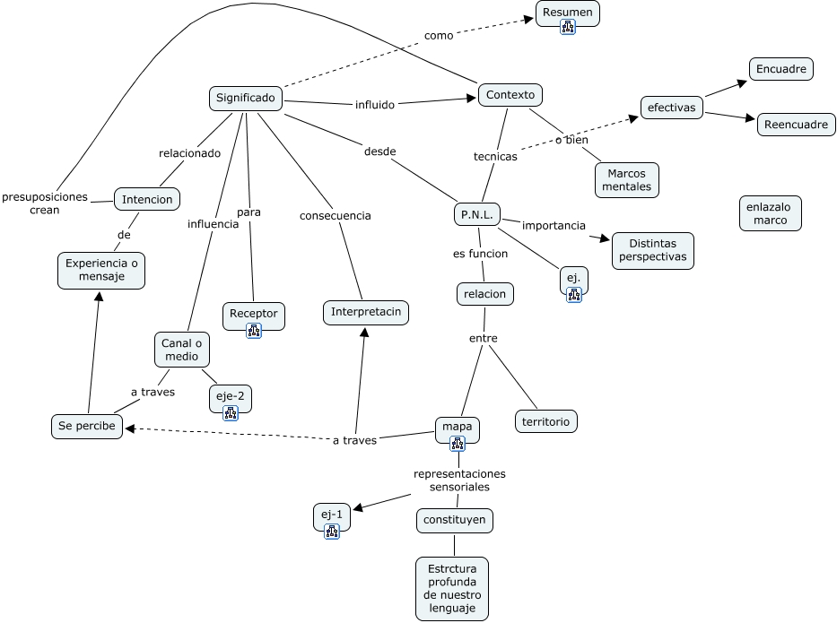 Este Cmap, tiene información relacionada con: Significado, Significado consecuencia Interpretacin, Contexto o bien Marcos mentales, Canal o medio a traves Se percibe, Intencion de Experiencia o mensaje, Significado influido Contexto, Significado influencia Canal o medio, Intencion presuposiciones crean Contexto, Significado para Receptor, efectivas Reencuadre, P.N.L. ej., Contexto tecnicas P.N.L., mapa representaciones sensoriales ej-1, relacion entre mapa, Significado como Resumen, Contexto tecnicas efectivas, Se percibe Experiencia o mensaje, mapa a traves Interpretacin, constituyen Estrctura profunda de nuestro lenguaje, efectivas Encuadre, P.N.L. importancia Distintas perspectivas