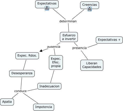 Este Cmap, tiene información relacionada con: Creencias Expectativas, Esfuerzo a invertir ausencia Expec. Efec. propia, Expec. Efec. propia Inadecuacion, Creencias determinan Esfuerzo a invertir, Expectativas determinan Esfuerzo a invertir, Esfuerzo a invertir presencia Liberan Capacidades, Esfuerzo a invertir ausencia Expec. Rdos., Desesperanza conduce Impotencia, Expec. Rdos. Desesperanza, Inadecuacion conduce Impotencia, Expectativas + presencia Liberan Capacidades, Inadecuacion conduce Apatia, Desesperanza conduce Apatia