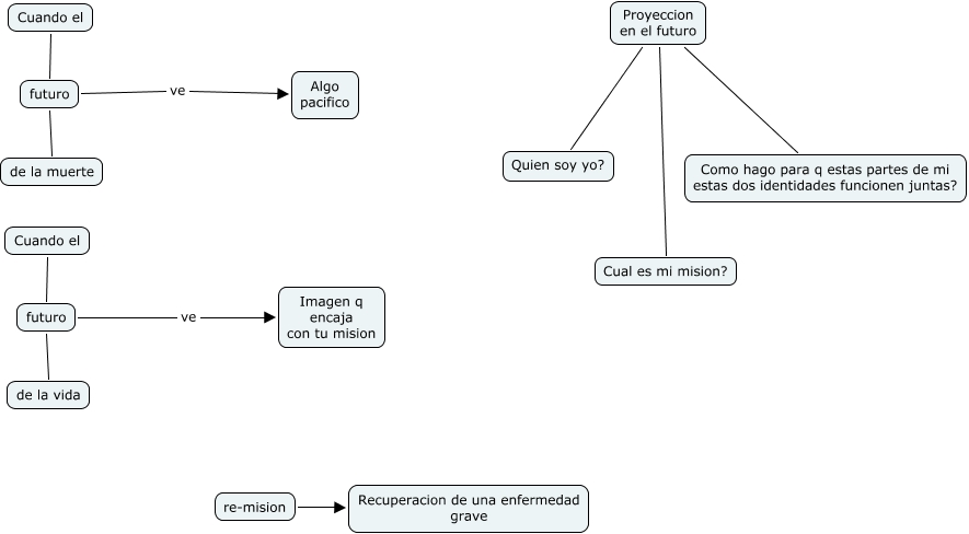 Este Cmap, tiene información relacionada con: Vision del futuro, futuro de la muerte, Cuando el futuro, Proyeccion en el futuro Quien soy yo?, re-mision Recuperacion de una enfermedad grave, futuro ve Algo pacifico, Proyeccion en el futuro Cual es mi mision?, futuro ve Imagen q encaja con tu mision, futuro de la vida, Proyeccion en el futuro Como hago para q estas partes de mi estas dos identidades funcionen juntas?, Cuando el futuro