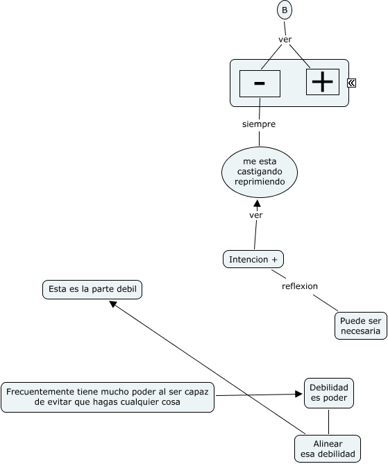 Este Cmap, tiene información relacionada con: Resumen intencion positiva, - siempre me esta castigando reprimiendo, Alinear esa debilidad Esta es la parte debil, Debilidad es poder Alinear esa debilidad, Frecuentemente tiene mucho poder al ser capaz de evitar que hagas cualquier cosa Debilidad es poder, Intencion + ver me esta castigando reprimiendo, B ver +, B ver -, Intencion + reflexion Puede ser necesaria