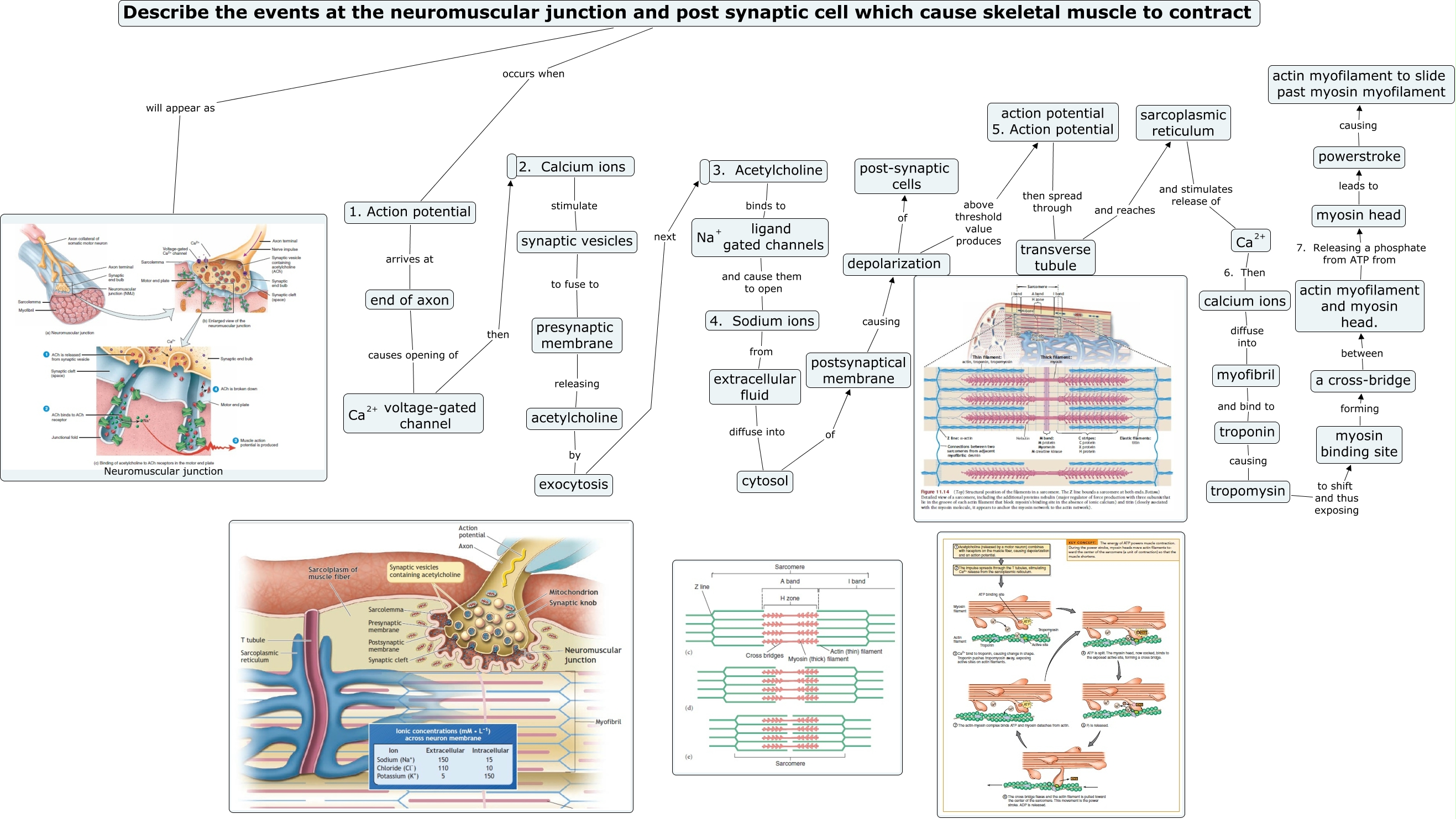 gated channels </mtext> </mrow> </math>, depolarization above threshold value produces action potential 5. Action potential, action potential 5. Action potential then spread through transverse tubule, acetylcholine by exocytosis, myosin head leads to powerstroke, Describe the events at the neuromuscular junction and post synaptic cell which cause skeletal muscle to contract will appear as Neuromuscular junction, postsynaptical membrane causing depolarization, 1. Action potential arrives at end of axon, 2. Calcium ions stimulate synaptic vesicles, 4. Sodium ions from extracellular fluid, extracellular fluid diffuse into cytosol