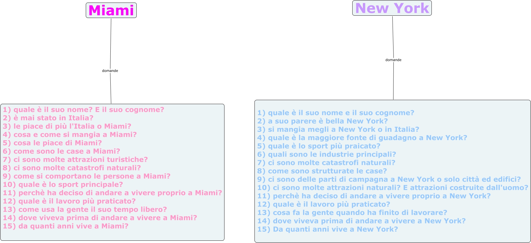 Questa Cmap, creata con IHMC CmapTools, contiene informazioni relative a: Domande di Valeria Pirola, New York domande 1) quale è il suo nome e il suo cognome? 2) a suo parere è bella New York? 3) si mangia megli a New York o in Italia? 4) quale è la maggiore fonte di guadagno a New York? 5) quale è lo sport più praicato? 6) quali sono le industrie principali? 7) ci sono molte catastrofi naturali? 8) come sono strutturate le case? 9) ci sono delle parti di campagna a New York o solo città ed edifici? 10) ci sono molte attrazioni naturali? E attrazioni costruite dall'uomo? 11) perchè ha deciso di andare a vivere proprio a New York? 12) quale è il lavoro più praticato? 13) cosa fa la gente quando ha finito di lavorare? 14) dove viveva prima di andare a vivere a New York? 15) Da quanti anni vive a New York?, Miami domande 1) quale è il suo nome? E il suo cognome? 2) è mai stato in Italia? 3) le piace di più l'Italia o Miami? 4) cosa e come si mangia a Miami? 5) cosa le piace di Miami? 6) come sono le case a Miami? 7) ci sono molte attrazioni turistiche? 8) ci sono molte catastrofi naturali? 9) come si comportano le persone a Miami? 10) quale è lo sport principale? 11) perchè ha deciso di andare a vivere proprio a Miami? 12) quale è il lavoro più praticato? 13) come usa la gente il suo tempo libero? 14) dove viveva prima di andare a vivere a Miami? 15) da quanti anni vive a Miami?