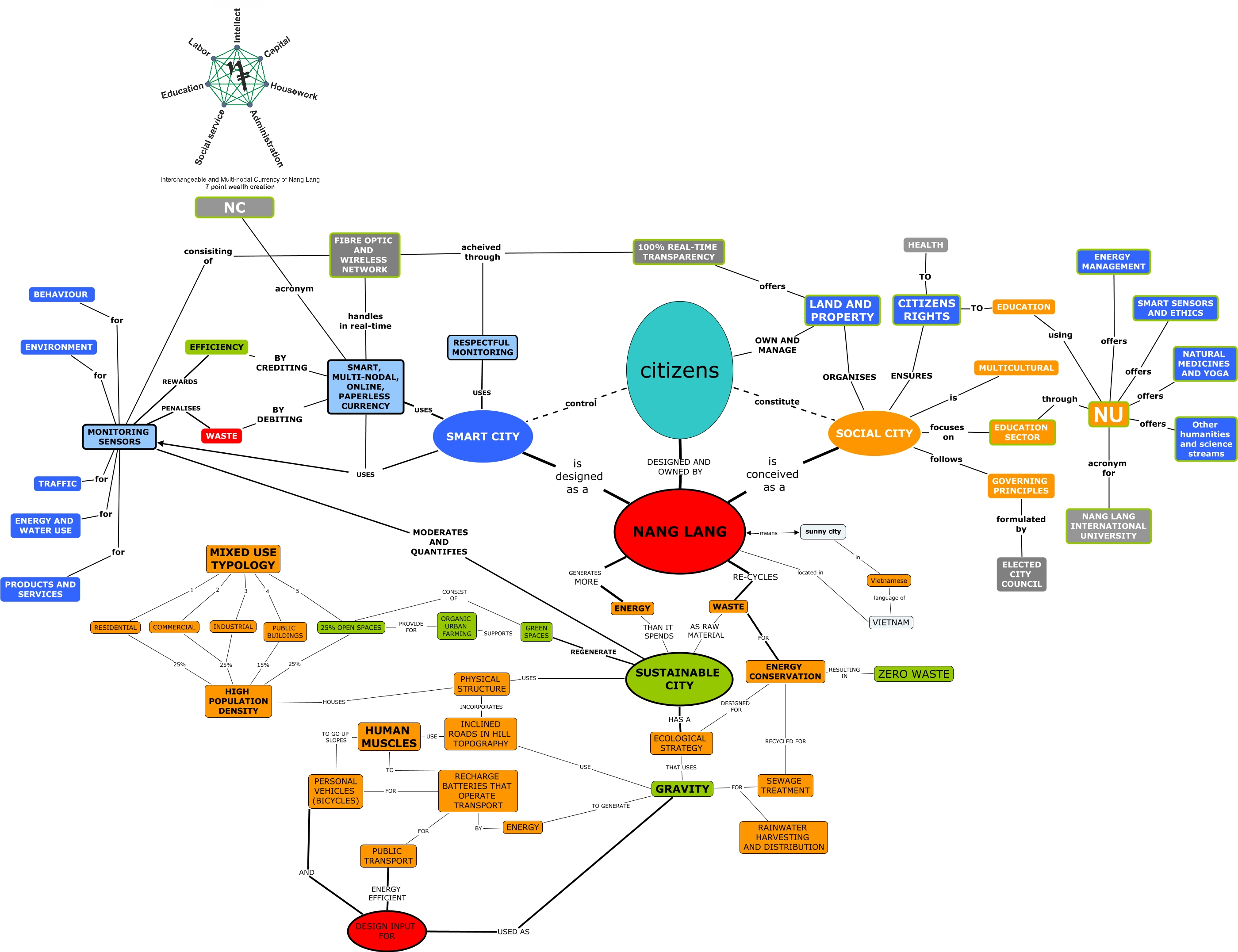 This Concept Map, created with IHMC CmapTools, has information related to: NANG LANG_2, COMMERCIAL 25% HIGH POPULATION DENSITY, SUSTAINABLE CITY HAS A ECOLOGICAL STRATEGY, SOCIAL CITY focuses on EDUCATION SECTOR, Vietnamese language of VIETNAM, PHYSICAL STRUCTURE HOUSES HIGH POPULATION DENSITY, NANG LANG located in VIETNAM, GRAVITY USED AS DESIGN INPUT FOR, FIBRE OPTIC AND WIRELESS NETWORK consisiting of MONITORING SENSORS, ENERGY CONSERVATION RECYCLED FOR SEWAGE TREATMENT, SUSTAINABLE CITY USES PHYSICAL STRUCTURE, ENERGY CONSERVATION FOR WASTE, SMART CITY USES SMART, MULTI-NODAL, ONLINE, PAPERLESS CURRENCY, HUMAN MUSCLES TO GO UP SLOPES PERSONAL VEHICLES (BICYCLES), RESIDENTIAL 25% HIGH POPULATION DENSITY, LAND AND PROPERTY offers 100% REAL-TIME TRANSPARENCY, NU offers NATURAL MEDICINES AND YOGA, SOCIAL CITY ORGANISES LAND AND PROPERTY, citizens control SMART CITY, MIXED USE TYPOLOGY 1 RESIDENTIAL, 100% REAL-TIME TRANSPARENCY acheived through RESPECTFUL MONITORING
