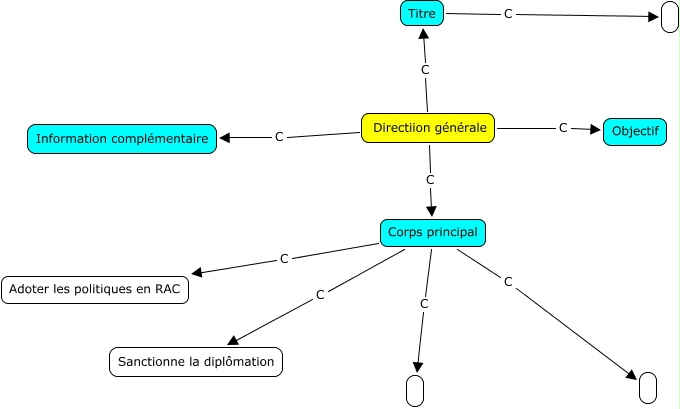 Cette carte de concepts créée avec IHMC CmapTools traite de: ressdg, Titre C, Corps principal C, Directiion générale C Objectif, Corps principal C Sanctionne la diplômation, Corps principal C Adoter les politiques en RAC, Directiion générale C Corps principal, Directiion générale C Information complémentaire, Corps principal C, Directiion générale C Titre