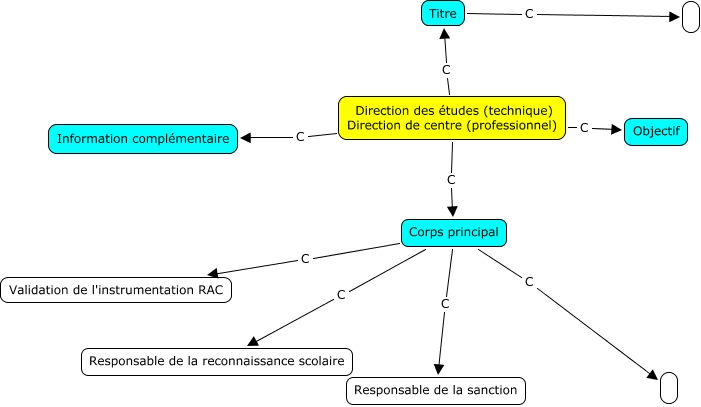 Cette carte de concepts créée avec IHMC CmapTools traite de: ressde, Direction des études (technique) Direction de centre (professionnel) C Corps principal, Corps principal C Validation de l'instrumentation RAC, Corps principal C Responsable de la sanction, Direction des études (technique) Direction de centre (professionnel) C Titre, Direction des études (technique) Direction de centre (professionnel) C Information complémentaire, Corps principal C, Corps principal C Responsable de la reconnaissance scolaire, Titre C, Direction des études (technique) Direction de centre (professionnel) C Objectif