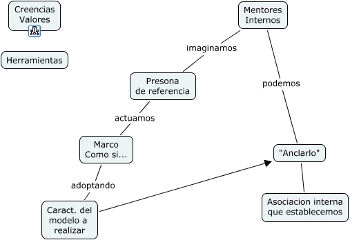Este Cmap, tiene información relacionada con: Creencias Herramientas Mentores Positivos, Caract. del modelo a realizar "Anclarlo", Presona de referencia actuamos Marco Como si..., Mentores Internos imaginamos Presona de referencia, "Anclarlo" Asociacion interna que establecemos, Mentores Internos podemos "Anclarlo", Marco Como si... adoptando Caract. del modelo a realizar