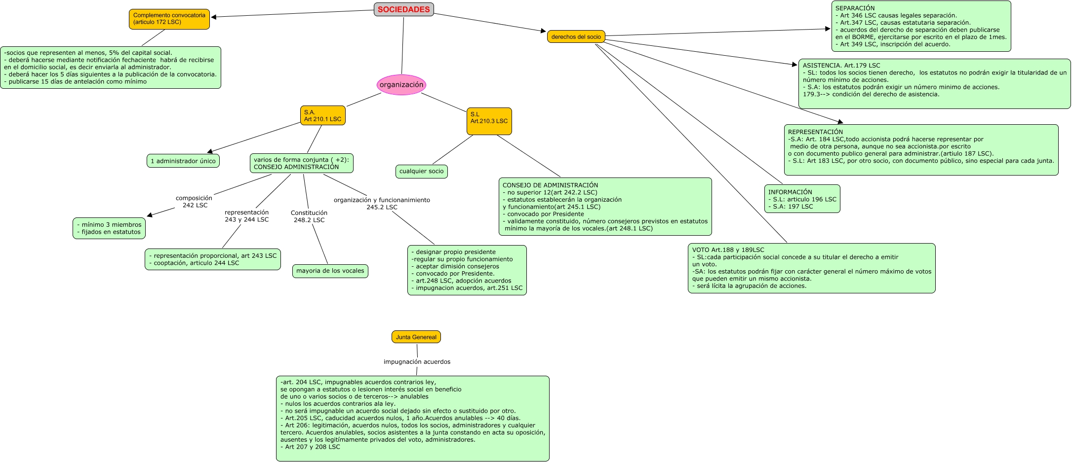 Este Cmap, tiene información relacionada con: escenario nº 5, derechos del socio ???? INFORMACIÓN - S.L: articulo 196 LSC - S.A: 197 LSC, derechos del socio ???? VOTO Art.188 y 189LSC - SL:cada participación social concede a su titular el derecho a emitir un voto. -SA: los estatutos podrán fijar con carácter general el número máximo de votos que pueden emitir un mismo accionista. - será lícita la agrupación de acciones., S.A. Art 210.1 LSC ???? varios de forma conjunta ( +2): CONSEJO ADMINISTRACIÓN, varios de forma conjunta ( +2): CONSEJO ADMINISTRACIÓN composición 242 LSC - mínimo 3 miembros - fijados en estatutos, derechos del socio ???? ASISTENCIA. Art.179 LSC - SL: todos los socios tienen derecho, los estatutos no podrán exigir la titularidad de un número mínimo de acciones. - S.A: los estatutos podrán exigir un número minimo de acciones. 179.3--> condición del derecho de asistencia., varios de forma conjunta ( +2): CONSEJO ADMINISTRACIÓN organización y funcionanimiento 245.2 LSC - designar propio presidente -regular su propio funcionamiento - aceptar dimisión consejeros - convocado por Presidente. - art.248 LSC, adopción acuerdos - impugnacion acuerdos, art.251 LSC, derechos del socio ???? SEPARACIÓN - Art 346 LSC causas legales separación. - Art.347 LSC, causas estatutaria separación. - acuerdos del derecho de separación deben publicarse en el BORME, ejercitarse por escrito en el plazo de 1mes. - Art 349 LSC, inscripción del acuerdo., Complemento convocatoria (articulo 172 LSC) ???? -socios que representen al menos, 5% del capital social. - deberá hacerse mediante notificación fechaciente habrá de recibirse en el domicilio social, es decir enviarla al administrador. - deberá hacer los 5 días siguientes a la publicación de la convocatoria. - publicarse 15 días de antelación como mínimo, varios de forma conjunta ( +2): CONSEJO ADMINISTRACIÓN Constitución 248.2 LSC mayoria de los vocales, SOCIEDADES organización S.A. Art 210.1 LSC, S.A. Art 210.1 LSC ???? 1 administrador único, Junta Genereal impugnación acuerdos -art. 204 LSC, impugnables acuerdos contrarios ley, se opongan a estatutos o lesionen interés social en beneficio de uno o varios socios o de terceros--> anulables - nulos los acuerdos contrarios ala ley. - no será impugnable un acuerdo social dejado sin efecto o sustituido por otro. - Art.205 LSC, caducidad acuerdos nulos, 1 año.Acuerdos anulables --> 40 días. - Art 206: legitimación, acuerdos nulos, todos los socios, administradores y cualquier tercero. Acuerdos anulables, socios asistentes a la junta constando en acta su oposición, ausentes y los legitímamente privados del voto, administradores. - Art 207 y 208 LSC, S.L Art.210.3 LSC ???? cualquier socio, SOCIEDADES organización S.L Art.210.3 LSC, S.L Art.210.3 LSC ???? CONSEJO DE ADMINISTRACIÓN - no superior 12(art 242.2 LSC) - estatutos establecerán la organización y funcionamiento(art 245.1 LSC) - convocado por Presidente - validamente constituido, número consejeros previstos en estatutos mínimo la mayoría de los vocales.(art 248.1 LSC), SOCIEDADES ???? derechos del socio, derechos del socio ???? REPRESENTACIÓN -S.A: Art. 184 LSC,todo accionista podrá hacerse representar por medio de otra persona, aunque no sea accionista.por escrito o con documento publico general para administrar.(artiulo 187 LSC). - S.L: Art 183 LSC, por otro socio, con documento público, sino especial para cada junta., varios de forma conjunta ( +2): CONSEJO ADMINISTRACIÓN representación 243 y 244 LSC - representación proporcional, art 243 LSC - cooptación, articulo 244 LSC, SOCIEDADES ???? Complemento convocatoria (articulo 172 LSC)