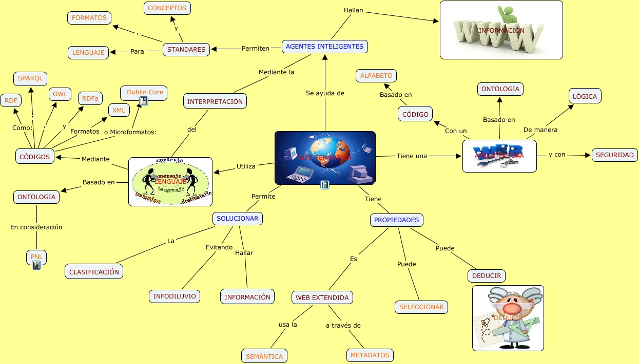 Este Cmap, tiene información relacionada con: Mapa Web Semantica, PROPIEDADES Puede DEDUCIR, WEB SEMÁNTICA Tiene una ARQUITECTURA, ARQUITECTURA y con SEGURIDAD, SOLUCIONAR Evitando INFODILUVIO, CÓDIGOS Formatos XML, ARQUITECTURA Con un CÓDIGO, WEB EXTENDIDA usa la SEMÁNTICA, WEB EXTENDIDA a través de METADATOS, SOLUCIONAR La CLASIFICACIÓN, WEB SEMÁNTICA Permite SOLUCIONAR, LENGUAJE Basado en ONTOLOGIA, CÓDIGO Basado en ALFABETO, WEB SEMÁNTICA Tiene PROPIEDADES, CÓDIGOS o Microformatos: Dublin Core, CÓDIGOS Como: RDF, ARQUITECTURA Basado en ONTOLOGIA, CÓDIGOS , SPARQL, LENGUAJE Mediante CÓDIGOS, STANDARES y CONCEPTOS, STANDARES Para LENGUAJE