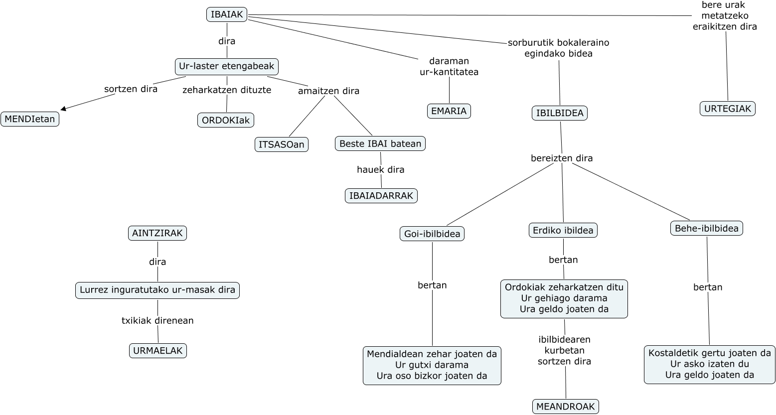 IHMC CmapTools-ekin sortu den kontzeptu-mapa honek honi buruzko informazioa du: Ibaiak eta Aintzirak - 2, Erdiko ibildea bertan Ordokiak zeharkatzen ditu Ur gehiago darama Ura geldo joaten da, IBAIAK daraman ur-kantitatea EMARIA, IBILBIDEA bereizten dira Erdiko ibildea, IBILBIDEA bereizten dira Behe-ibilbidea, Ur-laster etengabeak amaitzen dira Beste IBAI batean, Ur-laster etengabeak amaitzen dira ITSASOan, Ordokiak zeharkatzen ditu Ur gehiago darama Ura geldo joaten da ibilbidearen kurbetan sortzen dira MEANDROAK, Beste IBAI batean hauek dira IBAIADARRAK, Goi-ibilbidea bertan Mendialdean zehar joaten da Ur gutxi darama Ura oso bizkor joaten da, IBAIAK bere urak metatzeko eraikitzen dira URTEGIAK, IBAIAK dira Ur-laster etengabeak, Behe-ibilbidea bertan Kostaldetik gertu joaten da Ur asko izaten du Ura geldo joaten da, IBILBIDEA bereizten dira Goi-ibilbidea, IBAIAK sorburutik bokaleraino egindako bidea IBILBIDEA, Ur-laster etengabeak sortzen dira MENDIetan, Lurrez inguratutako ur-masak dira txikiak direnean URMAELAK, Ur-laster etengabeak zeharkatzen dituzte ORDOKIak, AINTZIRAK dira Lurrez inguratutako ur-masak dira