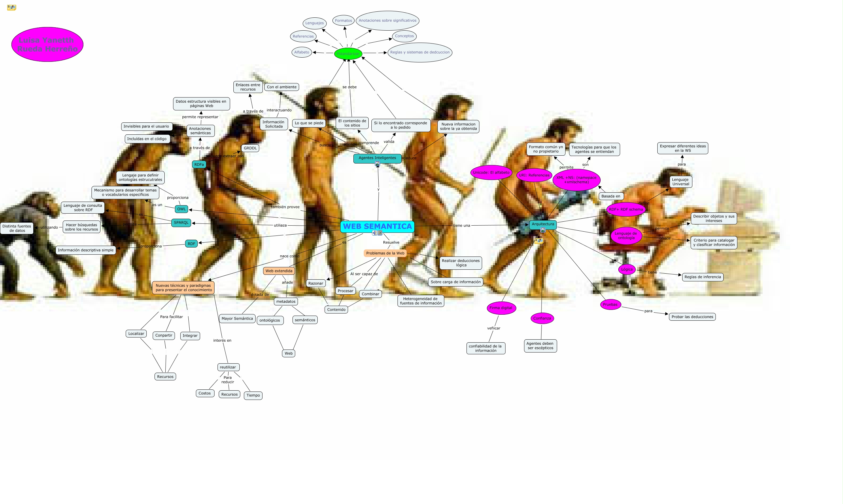 Este Cmap, tiene información relacionada con: MAPA WEB SEMANTICA1, reutilizar Para reducir Recursos, Lógica tiene Reglas de inferencia, XML +NS: (namepace +xmlschema) permite Formato común yn no propietario, Agentes Inteligentes valida Si lo encontrado corresponde a lo pedido, WEB SEMANTICA RDF, El contenido de los sitios se debe ????, Lo que se piede ????, Lenguaje de ontología permite Describir objetos y sus intereses, Arquitectura RDF+ RDF schema, Anotaciones semánticas Invisibles para el usuario, WEB SEMANTICA Resuelve Problemas de la Web, Arquitectura Lenguaje de ontología, metadatos semánticos, Problemas de la Web Sobre carga de información, Estandarizar Lenguajes, WEB SEMANTICA es Web extendida, Agentes Inteligentes buscará Información Solicitada, Integrar Recursos, RDF proporciona Información descriptiva simple, OWL es un Mecanismo para desarrollar temas o vocabularios especificos