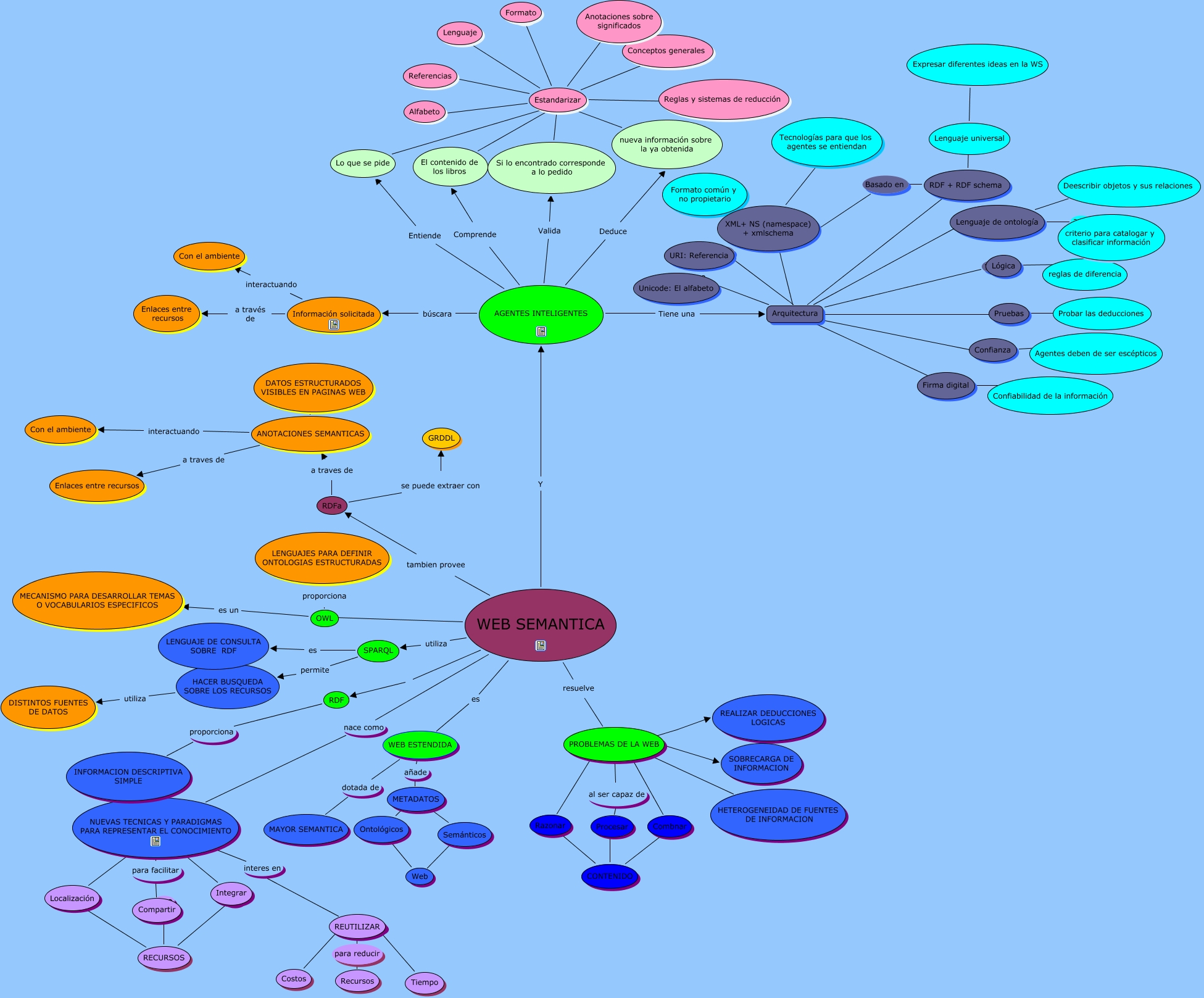 Este Cmap, tiene información relacionada con: MAPA WEB SEMANTICA, Arquitectura ???? Lenguaje de ontología, AGENTES INTELIGENTES Valida Si lo encontrado corresponde a lo pedido, Lógica ???? reglas de diferencia, PROBLEMAS DE LA WEB al ser capaz de Procesar, nueva información sobre la ya obtenida ???? Estandarizar, RECURSOS ???? Localización, AGENTES INTELIGENTES Entiende Lo que se pide, PROBLEMAS DE LA WEB ???? REALIZAR DEDUCCIONES LOGICAS, SPARQL permite HACER BUSQUEDA SOBRE LOS RECURSOS, WEB ESTENDIDA dotada de MAYOR SEMANTICA, CONTENIDO ???? Procesar, Arquitectura ???? RDF + RDF schema, RDFa se puede extraer con GRDDL, Localización ???? NUEVAS TECNICAS Y PARADIGMAS PARA REPRESENTAR EL CONOCIMIENTO, Arquitectura ???? Confianza, WEB SEMANTICA utiliza SPARQL, Lenguaje de ontología ???? criterio para catalogar y clasificar información, Arquitectura ???? Unicode: El alfabeto, ANOTACIONES SEMANTICAS interactuando Con el ambiente, PROBLEMAS DE LA WEB Combnar
