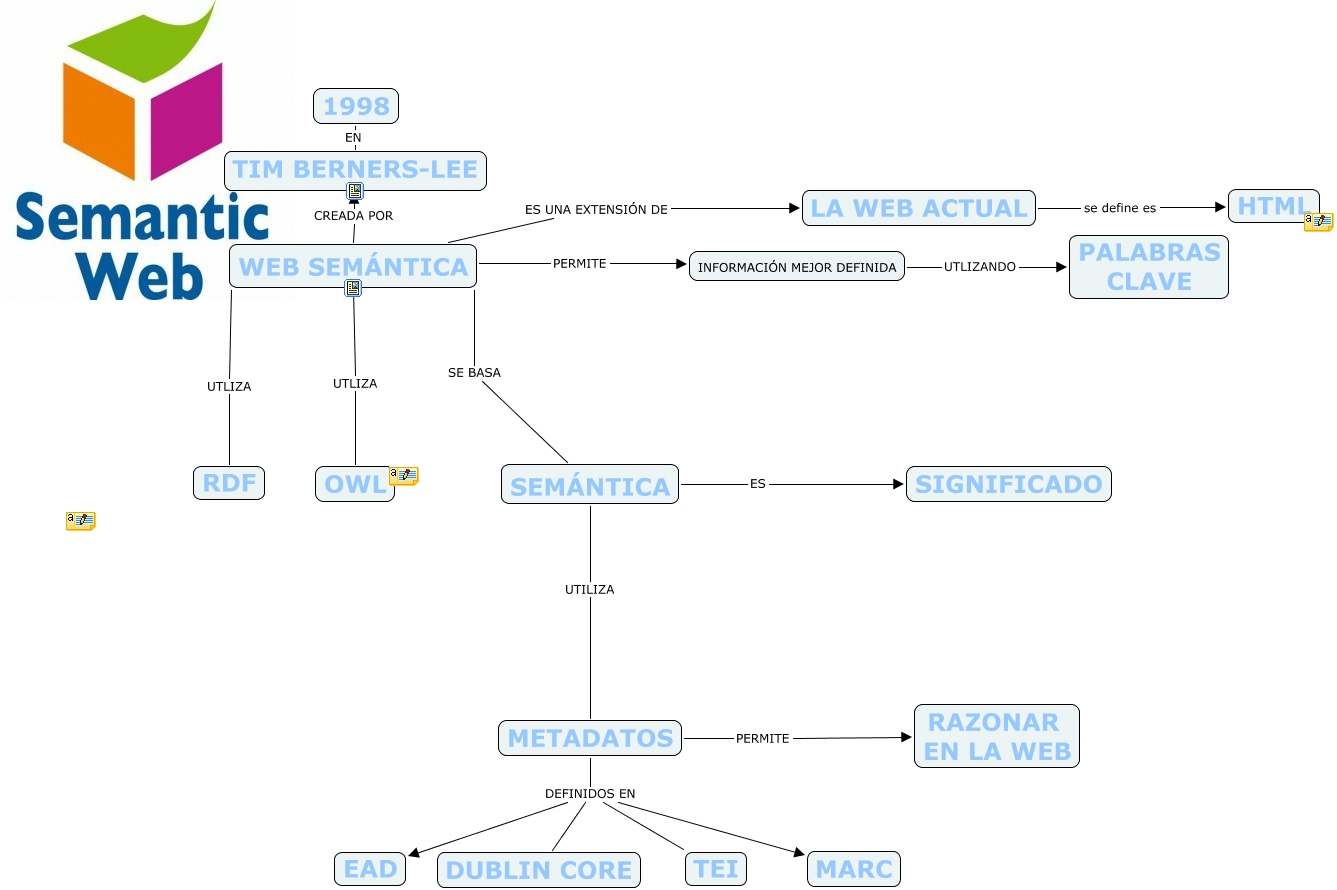 Este Cmap, tiene información relacionada con: Mapa web Mayra, WEB SEMÁNTICA CREADA POR TIM BERNERS-LEE, SEMÁNTICA ES SIGNIFICADO, WEB SEMÁNTICA ES UNA EXTENSIÓN DE LA WEB ACTUAL, TIM BERNERS-LEE EN 1998, LA WEB ACTUAL se define es HTML, METADATOS DEFINIDOS EN EAD, METADATOS DEFINIDOS EN MARC, METADATOS DEFINIDOS EN DUBLIN CORE, METADATOS PERMITE RAZONAR EN LA WEB, WEB SEMÁNTICA SE BASA SEMÁNTICA, INFORMACIÓN MEJOR DEFINIDA UTLIZANDO PALABRAS CLAVE, WEB SEMÁNTICA PERMITE INFORMACIÓN MEJOR DEFINIDA, WEB SEMÁNTICA UTLIZA RDF, SEMÁNTICA UTILIZA METADATOS, METADATOS DEFINIDOS EN TEI, WEB SEMÁNTICA UTLIZA OWL