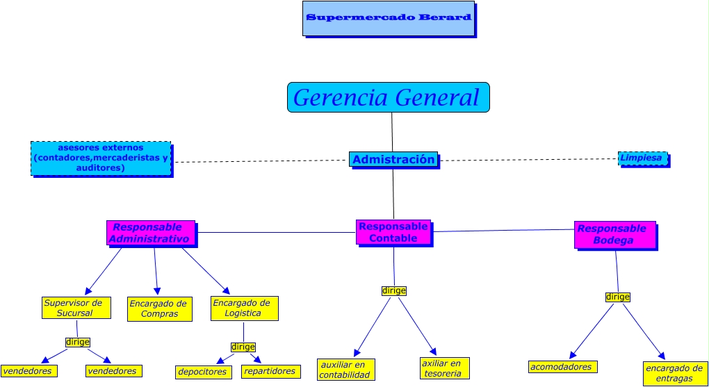 Este Cmap, tiene información relacionada con: jorge administracion, Responsable Administrativo ???? Encargado de Compras, Supervisor de Sucursal dirige vendedores, Responsable Contable dirige axiliar en tesoreria, asesores externos (contadores,mercaderistas y auditores) ???? Admistración, Responsable Administrativo ???? Supervisor de Sucursal, Encargado de Logistica dirige depocitores, Responsable Contable dirige auxiliar en contabilidad, Encargado de Logistica dirige repartidores, Responsable Contable ???? Responsable Administrativo, Supervisor de Sucursal dirige vendedores, Gerencia General ???? Responsable Contable, Responsable Contable ???? Responsable Bodega, Admistración ???? Limpiesa, Responsable Bodega dirige acomodadores, Responsable Administrativo ???? Encargado de Logistica, Responsable Bodega dirige encargado de entragas