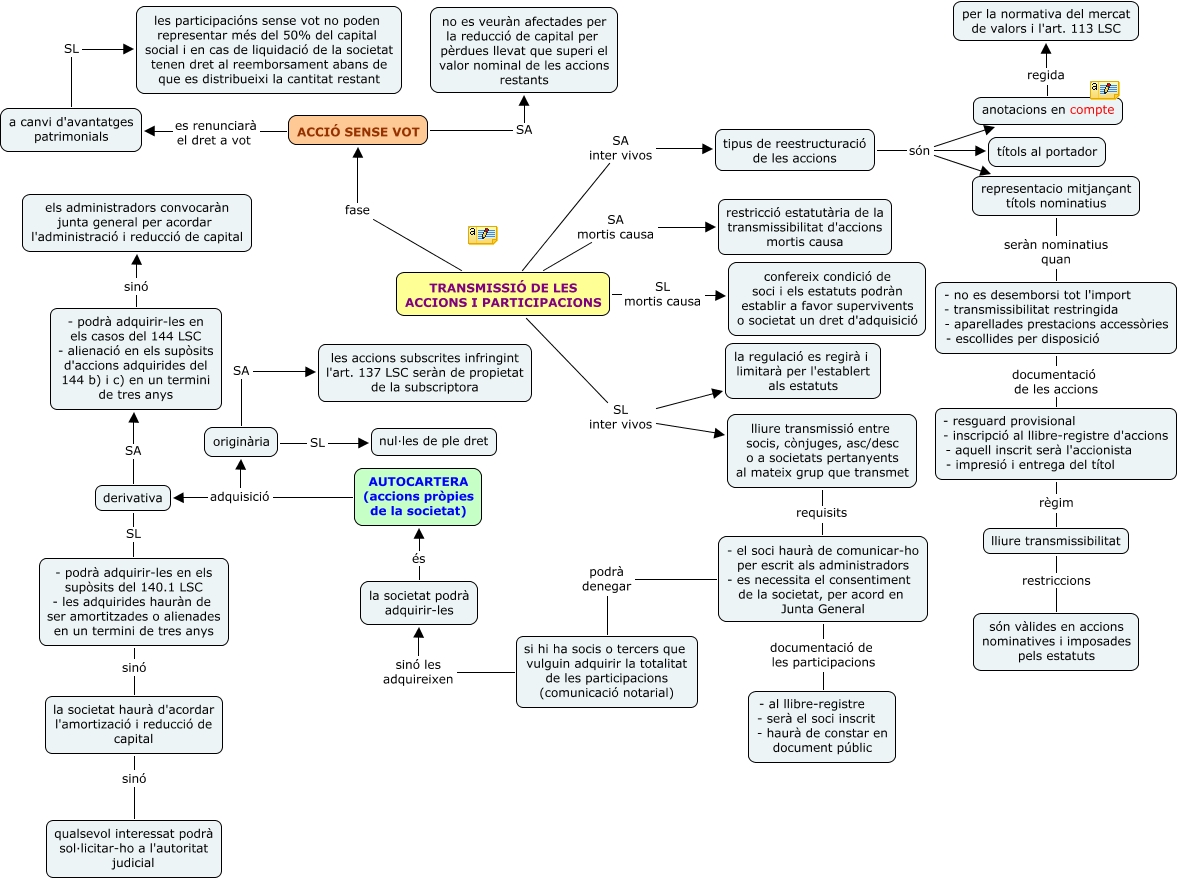 Este Cmap, tiene información relacionada con: Mapa conceptual 7, TRANSMISSIÓ DE LES ACCIONS I PARTICIPACIONS fase ACCIÓ SENSE VOT, representacio mitjançant títols nominatius seràn nominatius quan - no es desemborsi tot l'import - transmissibilitat restringida - aparellades prestacions accessòries - escollides per disposició, tipus de reestructuració de les accions són anotacions en compte, TRANSMISSIÓ DE LES ACCIONS I PARTICIPACIONS SA mortis causa restricció estatutària de la transmissibilitat d'accions mortis causa, - el soci haurà de comunicar-ho per escrit als administradors - es necessita el consentiment de la societat, per acord en Junta General documentació de les participacions - al llibre-registre - serà el soci inscrit - haurà de constar en document públic, TRANSMISSIÓ DE LES ACCIONS I PARTICIPACIONS SA inter vivos tipus de reestructuració de les accions, AUTOCARTERA (accions pròpies de la societat) adquisició originària, si hi ha socis o tercers que vulguin adquirir la totalitat de les participacions (comunicació notarial) sinó les adquireixen la societat podrà adquirir-les, tipus de reestructuració de les accions són títols al portador, - podrà adquirir-les en els casos del 144 LSC - alienació en els supòsits d'accions adquirides del 144 b) i c) en un termini de tres anys sinó els administradors convocaràn junta general per acordar l'administració i reducció de capital, derivativa SL - podrà adquirir-les en els supòsits del 140.1 LSC - les adquirides hauràn de ser amortitzades o alienades en un termini de tres anys, originària SL nul·les de ple dret, lliure transmissibilitat restriccions són vàlides en accions nominatives i imposades pels estatuts, - no es desemborsi tot l'import - transmissibilitat restringida - aparellades prestacions accessòries - escollides per disposició documentació de les accions - resguard provisional - inscripció al llibre-registre d'accions - aquell inscrit serà l'accionista - impresió i entrega del títol, TRANSMISSIÓ DE LES ACCIONS I PARTICIPACIONS SL inter vivos la regulació es regirà i limitarà per l'establert als estatuts, - resguard provisional - inscripció al llibre-registre d'accions - aquell inscrit serà l'accionista - impresió i entrega del títol règim lliure transmissibilitat, TRANSMISSIÓ DE LES ACCIONS I PARTICIPACIONS SL mortis causa confereix condició de soci i els estatuts podràn establir a favor supervivents o societat un dret d'adquisició, anotacions en compte regida per la normativa del mercat de valors i l'art. 113 LSC, ACCIÓ SENSE VOT es renunciarà el dret a vot a canvi d'avantatges patrimonials, la societat podrà adquirir-les és AUTOCARTERA (accions pròpies de la societat)