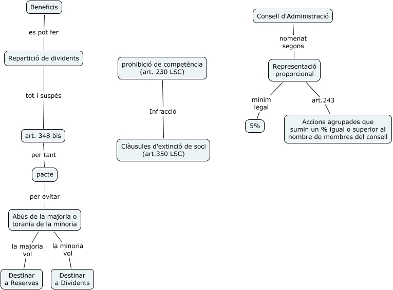 Este Cmap, tiene información relacionada con: Escenari 6, Representació proporcional art.243 Accions agrupades que sumin un % igual o superior al nombre de membres del consell, Beneficis es pot fer Repartició de dividents, Abús de la majoria o torania de la minoria la majoria vol Destinar a Reserves, Repartició de dividents tot i suspès art. 348 bis, pacte per evitar Abús de la majoria o torania de la minoria, art. 348 bis per tant pacte, Abús de la majoria o torania de la minoria la minoria vol Destinar a Dividents, prohibició de competència (art. 230 LSC) Infracció Clàusules d'extinció de soci (art.350 LSC), Representació proporcional mínim legal 5%, Consell d'Administració nomenat segons Representació proporcional