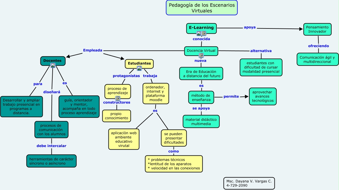 Este Cmap, tiene información relacionada con: Pedagogía de los Escenarios Virtuales, Pensamiento Innovador ofreciendo Comunicación ágil y multidireccional, Docentes para Desarrollar y ampliar trabajo presencial en programas a distancia., procesos de comunicación con los alumnos debe intercalar herramientas de carácter síncrono o asíncrono, Docencia Virtual Empleada Docentes, proceso de aprendizaje constructores propio conocimiento, se pueden presentar dificultades como * problemas técnicos *lentitud de los aparatos * velocidad en las conexiones, Docentes es guía, orientador y mentor, acompaña en todo proceso aprendizaje, Estudiantes trabaja ordenador, internet y plataforma moodle, Docencia Virtual Empleada Estudiantes, E-Learning conocida Docencia Virtual, E-Learning apoya Pensamiento Innovador, Era de Educaciòn a distancia del futuro es método de enseñanza, Estudiantes protagonistas proceso de aprendizaje, Docencia Virtual alternativa estudiantes con dificultad de cursar modalidad presencial, método de enseñanza se apoya material didáctico multimedia, ordenador, internet y plataforma moodle es se pueden presentar dificultades, Docentes diseñará procesos de comunicación con los alumnos, Docencia Virtual nueva Era de Educaciòn a distancia del futuro, ordenador, internet y plataforma moodle es aplicaciòn web ambiente educativo virutal, método de enseñanza permite aprovechar avances tecnológicos