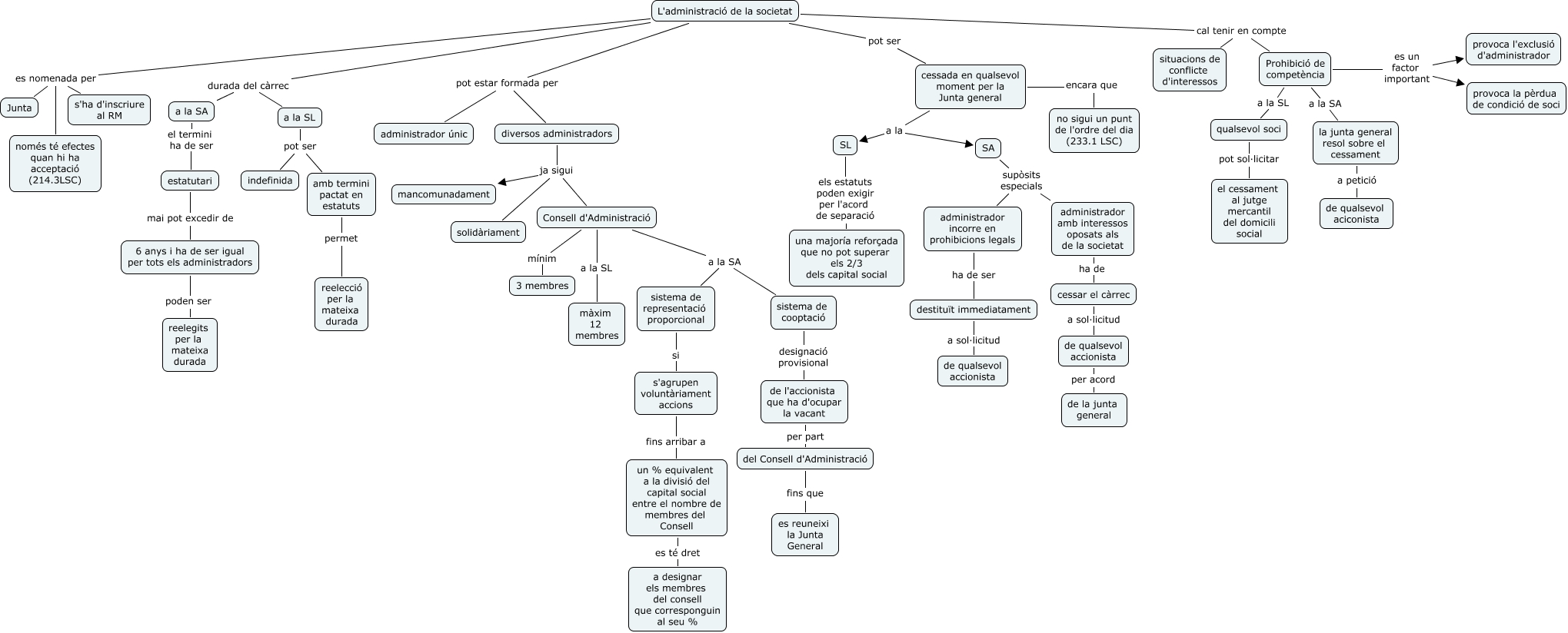 Este Cmap, tiene información relacionada con: Mapa 5, cessada en qualsevol moment per la Junta general a la SA, s'agrupen voluntàriament accions fins arribar a un % equivalent a la divisió del capital social entre el nombre de membres del Consell, administrador amb interessos oposats als de la societat ha de cessar el càrrec, a la SL pot ser indefinida, sistema de representació proporcional si s'agrupen voluntàriament accions, Consell d'Administració a la SA sistema de representació proporcional, Consell d'Administració mínim 3 membres, qualsevol soci pot sol·licitar el cessament al jutge mercantil del domicili social, SA supòsits especials administrador amb interessos oposats als de la societat, Prohibició de competència es un factor important provoca l'exclusió d'administrador, cessada en qualsevol moment per la Junta general a la SL, L'administració de la societat durada del càrrec a la SL, Prohibició de competència a la SL qualsevol soci, L'administració de la societat pot estar formada per administrador únic, Consell d'Administració a la SL màxim 12 membres, L'administració de la societat es nomenada per Junta, cessar el càrrec a sol·licitud de qualsevol accionista, un % equivalent a la divisió del capital social entre el nombre de membres del Consell es té dret a designar els membres del consell que corresponguin al seu %, destituït immediatament a sol·licitud de qualsevol accionista, estatutari mai pot excedir de 6 anys i ha de ser igual per tots els administradors