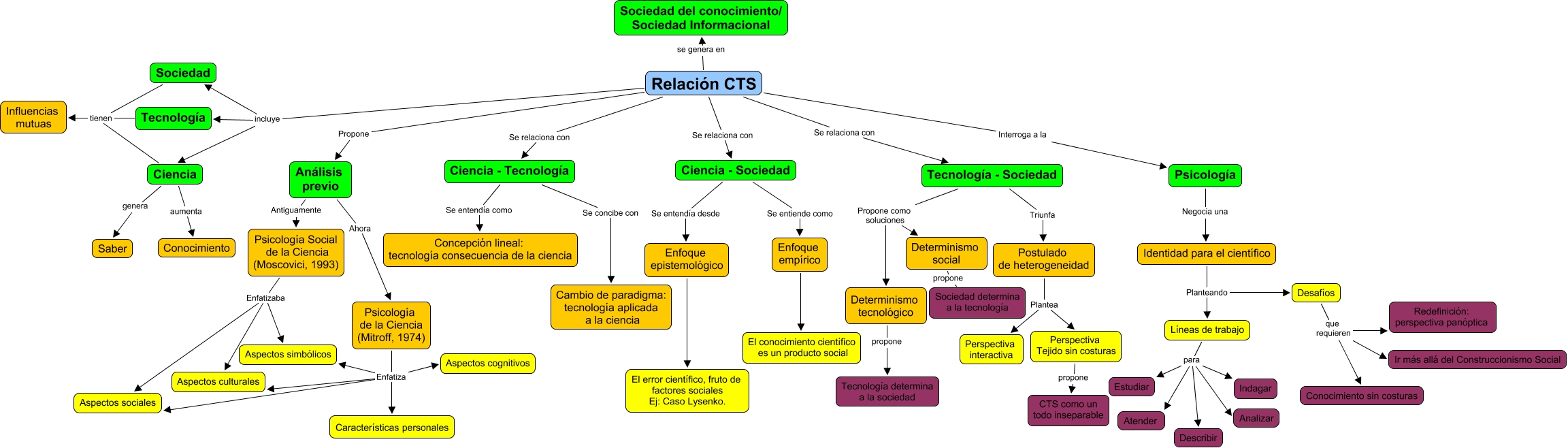 Este Cmap, tiene información relacionada con: MartínezDomgo_MardonesArin_mapa1, Tecnología - Sociedad Triunfa Postulado de heterogeneidad, Determinismo social propone Sociedad determina a la tecnología, Relación CTS incluye Ciencia, Perspectiva Tejido sin costuras propone CTS como un todo inseparable, Líneas de trabajo para Indagar, Identidad para el científico Planteando Desafíos, Relación CTS se genera en Sociedad del conocimiento/ Sociedad Informacional, Ciencia genera Saber, Psicología Social de la Ciencia (Moscovici, 1993) Enfatizaba Aspectos culturales, Desafíos que requieren Conocimiento sin costuras, Psicología de la Ciencia (Mitroff, 1974) Enfatiza Aspectos cognitivos, Enfoque empírico El conocimiento científico es un producto social, Relación CTS Interroga a la Psicología, Psicología Negocia una Identidad para el científico, Ciencia - Sociedad Se entendía desde Enfoque epistemológico, Tecnología - Sociedad Propone como soluciones Determinismo tecnológico, Ciencia - Tecnología Se concibe con Cambio de paradigma: tecnología aplicada a la ciencia, Análisis previo Ahora Psicología de la Ciencia (Mitroff, 1974), Psicología de la Ciencia (Mitroff, 1974) Enfatiza Características personales, Determinismo tecnológico propone Tecnología determina a la sociedad