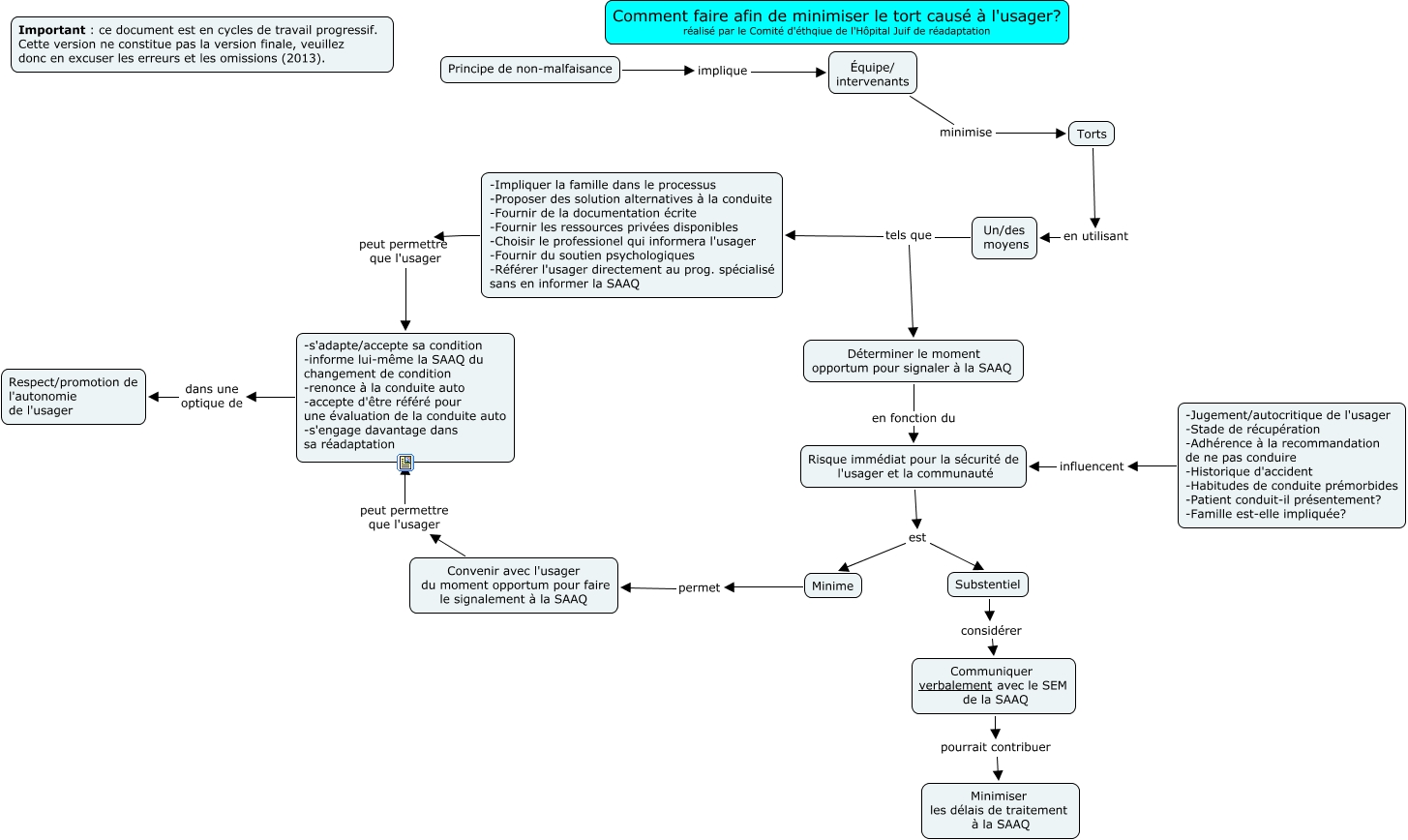 Cette carte de concepts créée avec IHMC CmapTools traite de: comment min. torts 29 avril.cmap, Déterminer le moment opportum pour signaler à la SAAQ en fonction du Risque immédiat pour la sécurité de l'usager et la communauté, Équipe/ intervenants minimise Torts, Torts en utilisant Un/des moyens, Un/des moyens tels que Déterminer le moment opportum pour signaler à la SAAQ, Convenir avec l'usager du moment opportum pour faire le signalement à la SAAQ peut permettre que l'usager -s'adapte/accepte sa condition -informe lui-même la SAAQ du changement de condition -renonce à la conduite auto -accepte d'être référé pour une évaluation de la conduite auto -s'engage davantage dans sa réadaptation, Risque immédiat pour la sécurité de l'usager et la communauté est Substentiel, Substentiel considérer Communiquer verbalement avec le SEM de la SAAQ, Risque immédiat pour la sécurité de l'usager et la communauté est Minime, Principe de non-malfaisance implique Équipe/ intervenants, -Jugement/autocritique de l'usager -Stade de récupération -Adhérence à la recommandation de ne pas conduire -Historique d'accident -Habitudes de conduite prémorbides -Patient conduit-il présentement? -Famille est-elle impliquée? influencent Risque immédiat pour la sécurité de l'usager et la communauté, Un/des moyens tels que -Impliquer la famille dans le processus -Proposer des solution alternatives à la conduite -Fournir de la documentation écrite -Fournir les ressources privées disponibles -Choisir le professionel qui informera l'usager -Fournir du soutien psychologiques -Référer l'usager directement au prog. spécialisé sans en informer la SAAQ, Communiquer verbalement avec le SEM de la SAAQ pourrait contribuer Minimiser les délais de traitement à la SAAQ, -s'adapte/accepte sa condition -informe lui-même la SAAQ du changement de condition -renonce à la conduite auto -accepte d'être référé pour une évaluation de la conduite auto -s'engage davantage dans sa réadaptation dans une optique de Respect/promotion de l'autonomie de l'usager, -Impliquer la famille dans le processus -Proposer des solution alternatives à la conduite -Fournir de la documentation écrite -Fournir les ressources privées disponibles -Choisir le professionel qui informera l'usager -Fournir du soutien psychologiques -Référer l'usager directement au prog. spécialisé sans en informer la SAAQ peut permettre que l'usager -s'adapte/accepte sa condition -informe lui-même la SAAQ du changement de condition -renonce à la conduite auto -accepte d'être référé pour une évaluation de la conduite auto -s'engage davantage dans sa réadaptation, Minime permet Convenir avec l'usager du moment opportum pour faire le signalement à la SAAQ