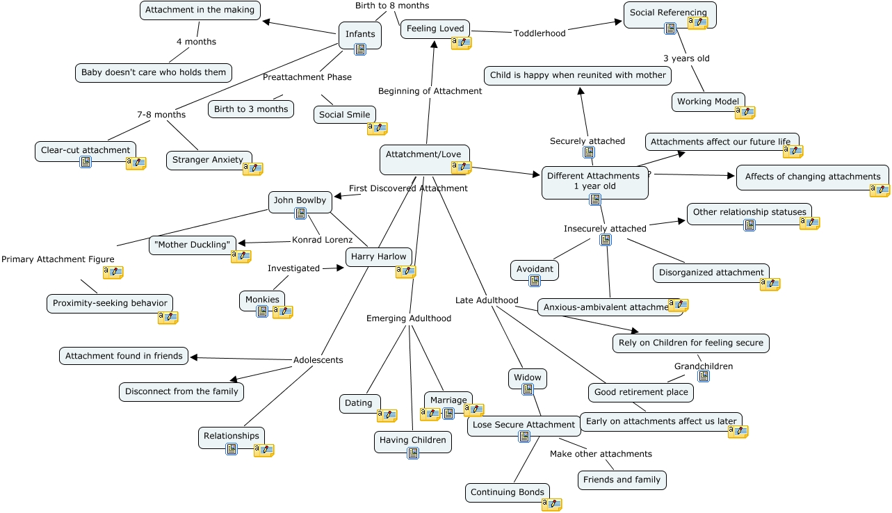 This Concept Map, created with IHMC CmapTools, has information related to: Vanderbyl R, Attatchment/Love Late Adulthood Widow, Monkies Investigated Harry Harlow, Attatchment/Love Late Adulthood Rely on Children for feeling secure, Different Attachments 1 year old Securely attached Child is happy when reunited with mother, Widow Continuing Bonds, Lose Secure Attachment Make other attachments Friends and family, Infants Birth to 8 months Feeling Loved, Different Attachments 1 year old Insecurely attached Disorganized attachment, Widow Lose Secure Attachment, Attatchment/Love Adolescents Relationships, Attatchment/Love Beginning of Attachment Feeling Loved, Attatchment/Love Emerging Adulthood Having Children, Rely on Children for feeling secure Grandchildren Good retirement place, Different Attachments 1 year old Insecurely attached Avoidant, Attatchment/Love Late Adulthood Early on attachments affect us later, John Bowlby Konrad Lorenz "Mother Duckling", Attatchment/Love ???? Different Attachments 1 year old, Infants ???? Attachment in the making, Different Attachments 1 year old ???? Affects of changing attachments, Infants 7-8 months Clear-cut attachment
