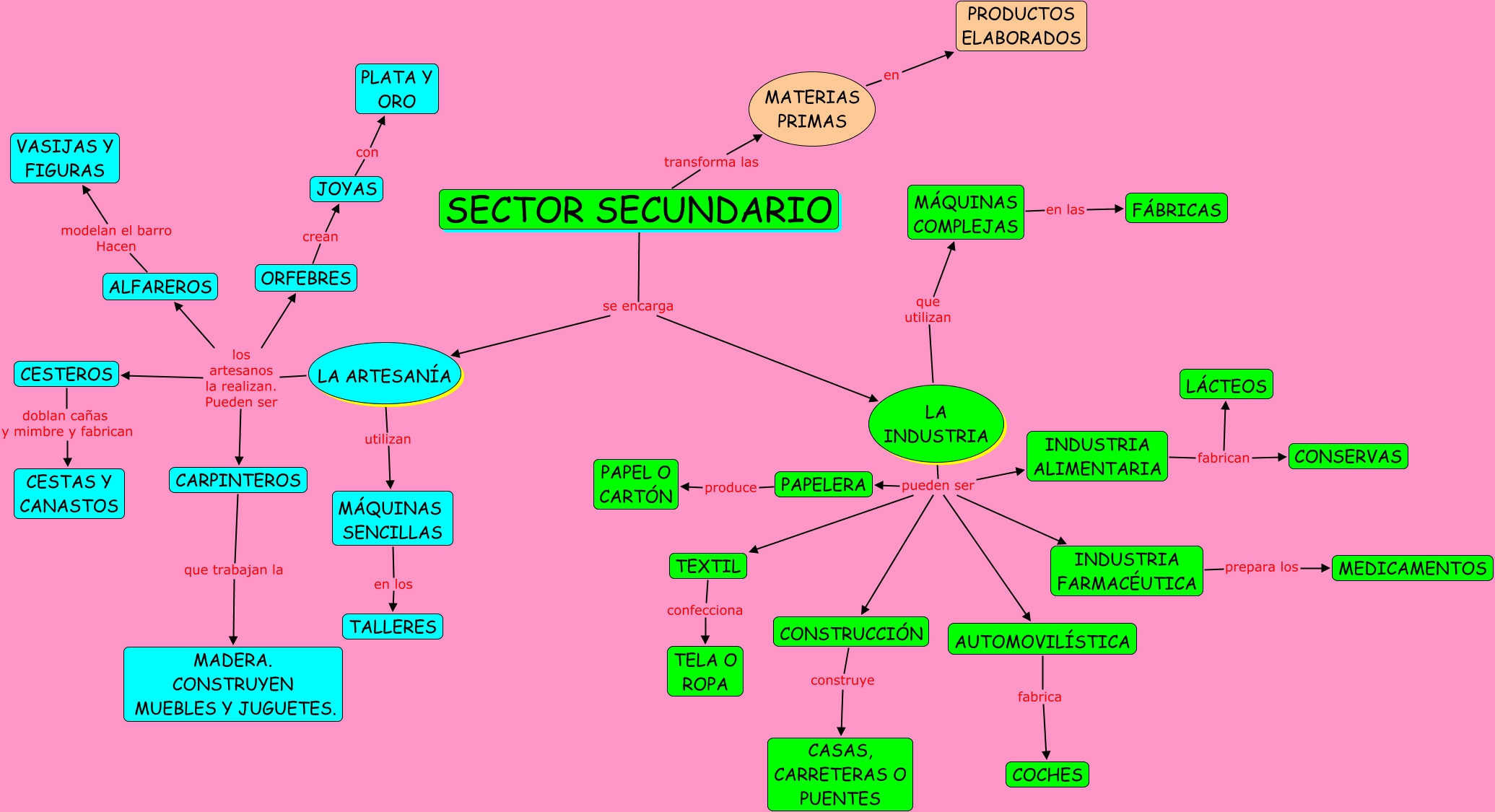 Este Cmap, tiene información relacionada con: SECTOR SECUNDARIO, ORFEBRES crean JOYAS, LA INDUSTRIA pueden ser AUTOMOVILÍSTICA, LA ARTESANÍA los artesanos la realizan. Pueden ser CESTEROS, INDUSTRIA ALIMENTARIA fabrican CONSERVAS, LA INDUSTRIA que utilizan MÁQUINAS COMPLEJAS, CESTEROS doblan cañas y mimbre y fabrican CESTAS Y CANASTOS, LA INDUSTRIA pueden ser INDUSTRIA FARMACÉUTICA, LA INDUSTRIA pueden ser PAPELERA, LA INDUSTRIA pueden ser TEXTIL, SECTOR SECUNDARIO se encarga LA ARTESANÍA, LA ARTESANÍA los artesanos la realizan. Pueden ser CARPINTEROS, LA ARTESANÍA los artesanos la realizan. Pueden ser ORFEBRES, MÁQUINAS SENCILLAS en los TALLERES, LA ARTESANÍA los artesanos la realizan. Pueden ser ALFAREROS, MATERIAS PRIMAS en PRODUCTOS ELABORADOS, CONSTRUCCIÓN construye CASAS, CARRETERAS O PUENTES, CARPINTEROS que trabajan la MADERA. CONSTRUYEN MUEBLES Y JUGUETES., LA ARTESANÍA utilizan MÁQUINAS SENCILLAS, AUTOMOVILÍSTICA fabrica COCHES, LA INDUSTRIA pueden ser CONSTRUCCIÓN