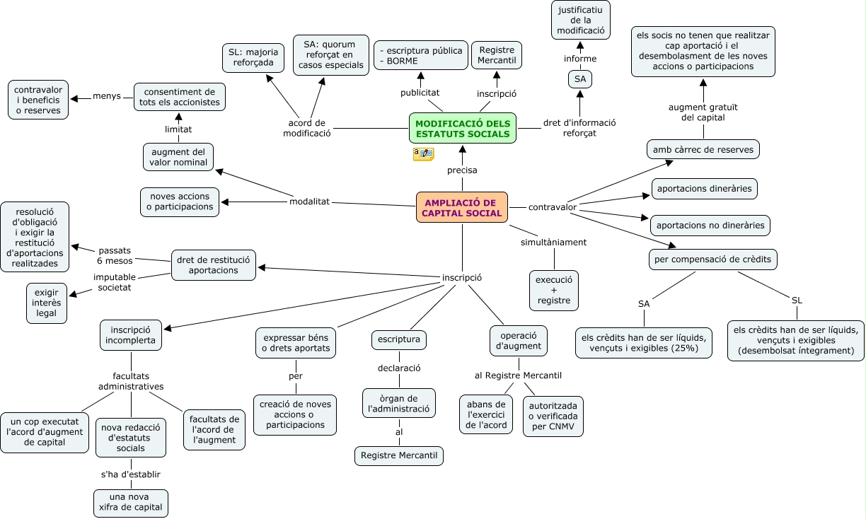 Este Cmap, tiene información relacionada con: Mapa conceptual 8, per compensació de crèdits SA els crèdits han de ser líquids, vençuts i exigibles (25%), AMPLIACIÓ DE CAPITAL SOCIAL precisa MODIFICACIÓ DELS ESTATUTS SOCIALS, inscripció incomplerta facultats administratives facultats de l'acord de l'augment, MODIFICACIÓ DELS ESTATUTS SOCIALS dret d'informació reforçat SA, escriptura declaració òrgan de l'administració, amb càrrec de reserves augment gratuït del capital els socis no tenen que realitzar cap aportació i el desembolasment de les noves accions o participacions, AMPLIACIÓ DE CAPITAL SOCIAL modalitat augment del valor nominal, AMPLIACIÓ DE CAPITAL SOCIAL inscripció escriptura, inscripció incomplerta facultats administratives nova redacció d'estatuts socials, inscripció incomplerta facultats administratives un cop executat l'acord d'augment de capital, AMPLIACIÓ DE CAPITAL SOCIAL contravalor aportacions no dineràries, AMPLIACIÓ DE CAPITAL SOCIAL inscripció inscripció incomplerta, MODIFICACIÓ DELS ESTATUTS SOCIALS acord de modificació SA: quorum reforçat en casos especials, expressar béns o drets aportats per creació de noves accions o participacions, MODIFICACIÓ DELS ESTATUTS SOCIALS inscripció Registre Mercantil, per compensació de crèdits SL els crèdits han de ser líquids, vençuts i exigibles (desembolsat íntegrament), AMPLIACIÓ DE CAPITAL SOCIAL inscripció dret de restitució aportacions, nova redacció d'estatuts socials s'ha d'establir una nova xifra de capital, AMPLIACIÓ DE CAPITAL SOCIAL contravalor per compensació de crèdits, consentiment de tots els accionistes menys contravalor i beneficis o reserves