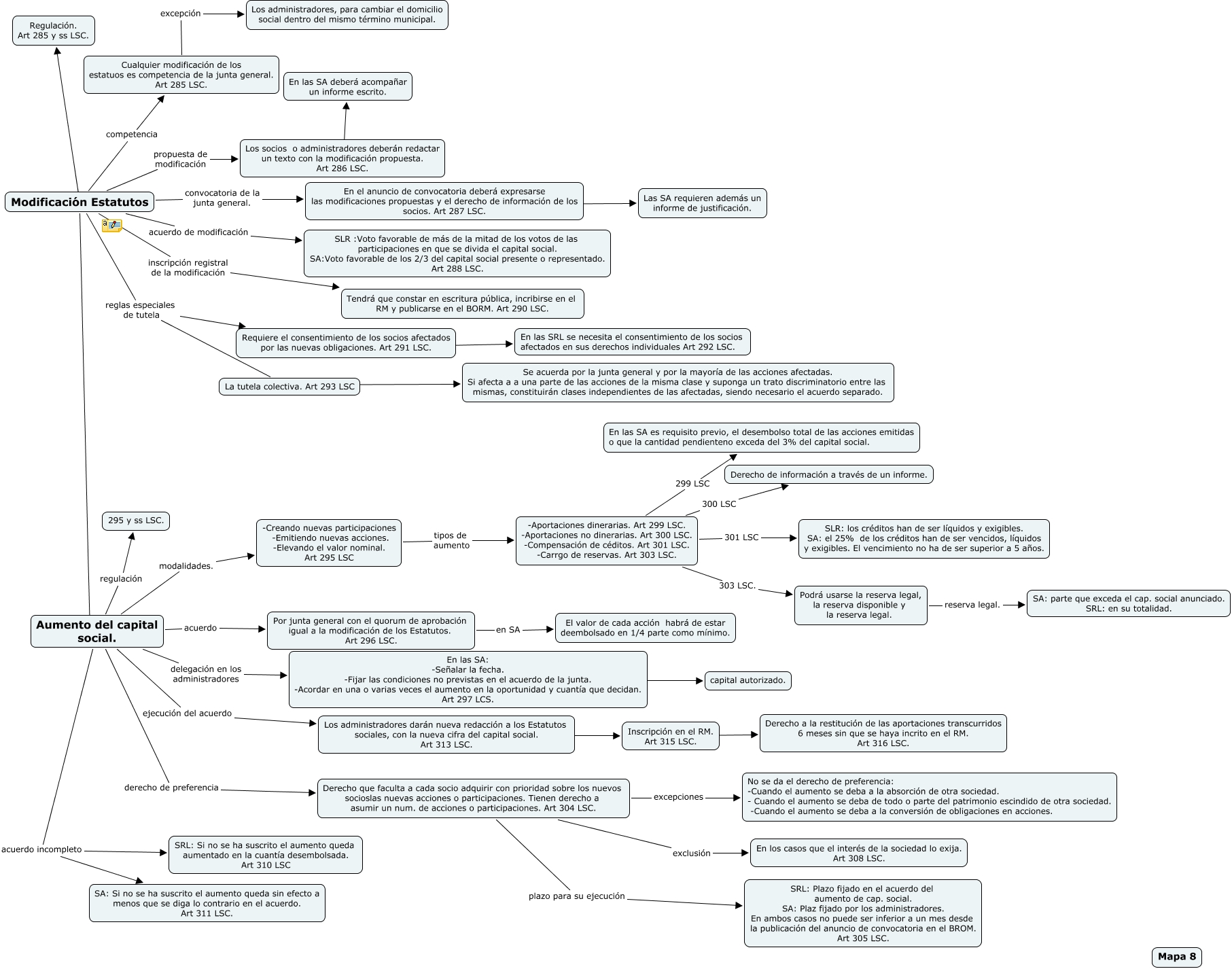 Este Cmap, tiene información relacionada con: caso practico octavo, Aumento del capital social. regulación 295 y ss LSC., En las SA: -Señalar la fecha. -Fijar las condiciones no previstas en el acuerdo de la junta. -Acordar en una o varias veces el aumento en la oportunidad y cuantía que decidan. Art 297 LCS. ???? capital autorizado., En el anuncio de convocatoria deberá expresarse las modificaciones propuestas y el derecho de información de los socios. Art 287 LSC. ???? Las SA requieren además un informe de justificación., Modificación Estatutos reglas especiales de tutela La tutela colectiva. Art 293 LSC, Inscripción en el RM. Art 315 LSC. ???? Derecho a la restitución de las aportaciones transcurridos 6 meses sin que se haya incrito en el RM. Art 316 LSC., Modificación Estatutos inscripción registral de la modificación Tendrá que constar en escritura pública, incribirse en el RM y publicarse en el BORM. Art 290 LSC., Podrá usarse la reserva legal, la reserva disponible y la reserva legal. reserva legal. SA: parte que exceda el cap. social anunciado. SRL: en su totalidad., Los administradores darán nueva redacción a los Estatutos sociales, con la nueva cifra del capital social. Art 313 LSC. ???? Inscripción en el RM. Art 315 LSC., Los socios o administradores deberán redactar un texto con la modificación propuesta. Art 286 LSC. ???? En las SA deberá acompañar un informe escrito., Modificación Estatutos acuerdo de modificación SLR :Voto favorable de más de la mitad de los votos de las participaciones en que se divida el capital social. SA:Voto favorable de los 2/3 del capital social presente o representado. Art 288 LSC., -Aportaciones dinerarias. Art 299 LSC. -Aportaciones no dinerarias. Art 300 LSC. -Compensación de céditos. Art 301 LSC. -Carrgo de reservas. Art 303 LSC. 301 LSC SLR: los créditos han de ser líquidos y exigibles. SA: el 25% de los créditos han de ser vencidos, líquidos y exigibles. El vencimiento no ha de ser superior a 5 años., Aumento del capital social. derecho de preferencia Derecho que faculta a cada socio adquirir con prioridad sobre los nuevos socioslas nuevas acciones o participaciones. Tienen derecho a asumir un num. de acciones o participaciones. Art 304 LSC., Aumento del capital social. ejecución del acuerdo Los administradores darán nueva redacción a los Estatutos sociales, con la nueva cifra del capital social. Art 313 LSC., Por junta general con el quorum de aprobación igual a la modificación de los Estatutos. Art 296 LSC. en SA El valor de cada acción habrá de estar deembolsado en 1/4 parte como mínimo., Modificación Estatutos convocatoria de la junta general. En el anuncio de convocatoria deberá expresarse las modificaciones propuestas y el derecho de información de los socios. Art 287 LSC., Aumento del capital social. modalidades. -Creando nuevas participaciones -Emitiendo nuevas acciones. -Elevando el valor nominal. Art 295 LSC, Modificación Estatutos propuesta de modificación Los socios o administradores deberán redactar un texto con la modificación propuesta. Art 286 LSC., Modificación Estatutos ???? Regulación. Art 285 y ss LSC., Cualquier modificación de los estatuos es competencia de la junta general. Art 285 LSC. excepción Los administradores, para cambiar el domicilio social dentro del mismo término municipal., Aumento del capital social. acuerdo incompleto SA: Si no se ha suscrito el aumento queda sin efecto a menos que se diga lo contrario en el acuerdo. Art 311 LSC.