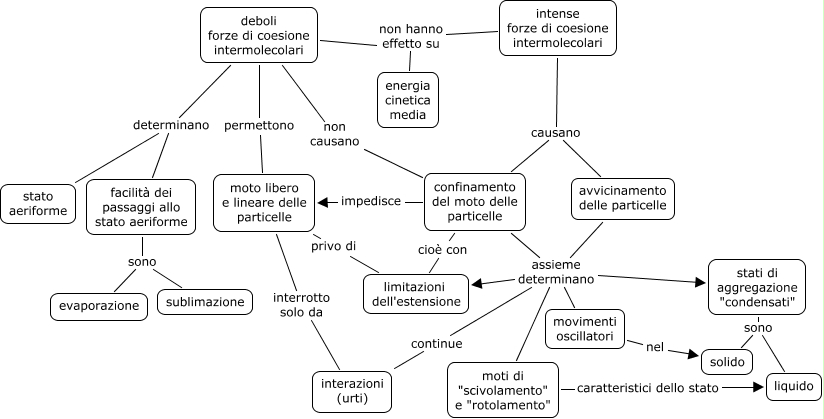 Questa Cmap, creata con IHMC CmapTools, contiene informazioni relative a: forze di coesione intermolecolari, avvicinamento delle particelle assieme determinano moti di "scivolamento" e "rotolamento", confinamento del moto delle particelle impedisce moto libero e lineare delle particelle, intense forze di coesione intermolecolari non hanno effetto su energia cinetica media, moto libero e lineare delle particelle interrotto solo da interazioni (urti), moto libero e lineare delle particelle privo di limitazioni dell'estensione, avvicinamento delle particelle assieme determinano movimenti oscillatori, confinamento del moto delle particelle assieme determinano stati di aggregazione "condensati", avvicinamento delle particelle assieme determinano continue interazioni (urti), confinamento del moto delle particelle assieme determinano continue interazioni (urti), deboli forze di coesione intermolecolari determinano stato aeriforme, avvicinamento delle particelle assieme determinano stati di aggregazione "condensati", confinamento del moto delle particelle assieme determinano moti di "scivolamento" e "rotolamento", confinamento del moto delle particelle assieme determinano movimenti oscillatori, confinamento del moto delle particelle assieme determinano limitazioni dell'estensione, facilità dei passaggi allo stato aeriforme sono evaporazione, deboli forze di coesione intermolecolari non hanno effetto su energia cinetica media, deboli forze di coesione intermolecolari determinano facilità dei passaggi allo stato aeriforme, intense forze di coesione intermolecolari causano avvicinamento delle particelle, intense forze di coesione intermolecolari causano confinamento del moto delle particelle, moti di "scivolamento" e "rotolamento" caratteristici dello stato liquido