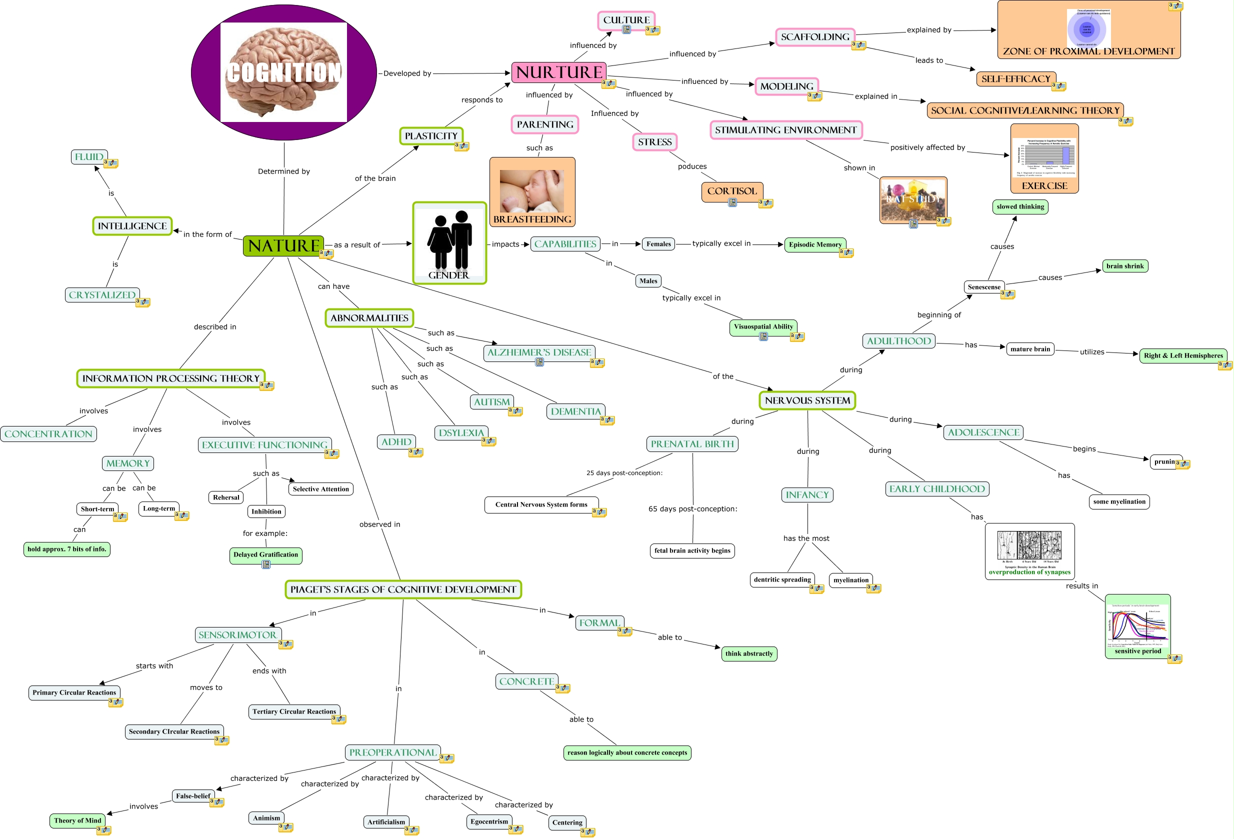 This Concept Map, created with IHMC CmapTools, has information related to: Rund R, Preoperational characterized by Artificialism, Executive Functioning such as Rehersal, Nature described in Information Processing Theory, ABnormalities such as ADHD, Preoperational characterized by False-belief, Intelligence is Fluid, Piaget's Stages of Cognitive Development in Preoperational, Adulthood has mature brain, Preoperational characterized by Centering, Piaget's Stages of Cognitive Development in Sensorimotor, mature brain utilizes Right & Left Hemispheres, ABnormalities such as DsyLEXIA, Plasticity responds to Nurture, Sensorimotor ends with Tertiary Circular Reactions, Parenting such as breastfeeding, Piaget's Stages of Cognitive Development in Concrete, ABnormalities such as AUTISM, Piaget's Stages of Cognitive Development in Formal, Nurture influenced by Parenting, Sensorimotor starts with Primary Circular Reactions