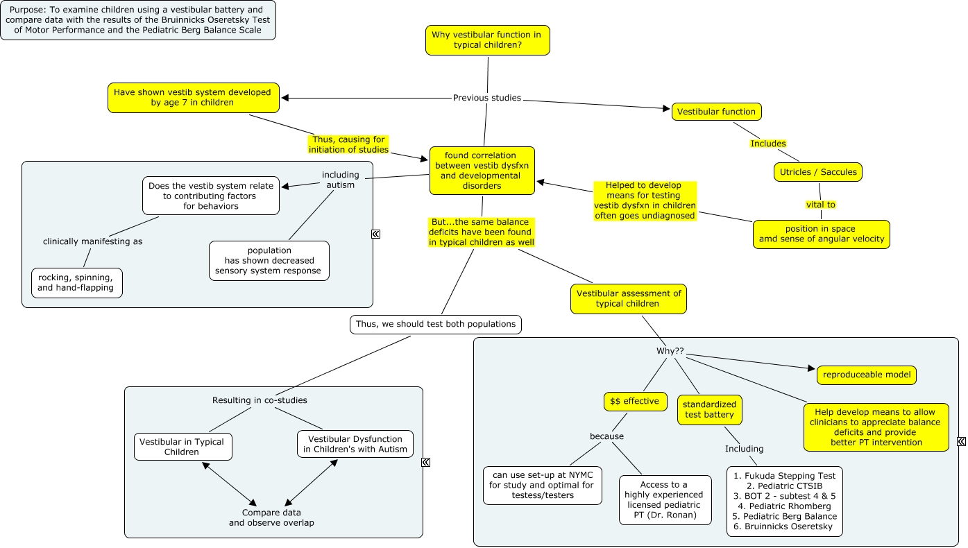 This Concept Map, created with IHMC CmapTools, has information related to: Project Rationale 2015, Why vestibular function in typical children? Previous studies Have shown vestib system developed by age 7 in children, Vestibular assessment of typical children Why?? standardized test battery, found correlation between vestib dysfxn and developmental disorders including autism Does the vestib system relate to contributing factors for behaviors, Vestibular assessment of typical children Why?? $$ effective, Vestibular assessment of typical children Why?? Help develop means to allow clinicians to appreciate balance deficits and provide better PT intervention, Utricles / Saccules vital to position in space amd sense of angular velocity, Vestibular assessment of typical children Why?? reproduceable model, Thus, we should test both populations Resulting in co-studies Vestibular Dysfunction in Children's with Autism, found correlation between vestib dysfxn and developmental disorders But...the same balance deficits have been found in typical children as well Vestibular assessment of typical children, Vestibular in Typical Children Compare data and observe overlap Vestibular Dysfunction in Children's with Autism, Does the vestib system relate to contributing factors for behaviors clinically manifesting as rocking, spinning, and hand-flapping, $$ effective because Access to a highly experienced licensed pediatric PT (Dr. Ronan), Vestibular function Includes Utricles / Saccules, Thus, we should test both populations Resulting in co-studies Vestibular in Typical Children, $$ effective because can use set-up at NYMC for study and optimal for testess/testers, position in space amd sense of angular velocity Helped to develop means for testing vestib dysfxn in children often goes undiagnosed found correlation between vestib dysfxn and developmental disorders, Have shown vestib system developed by age 7 in children Thus, causing for initiation of studies found correlation between vestib dysfxn and developmental disorders, Why vestibular function in typical children? Previous studies Vestibular function, found correlation between vestib dysfxn and developmental disorders But...the same balance deficits have been found in typical children as well Thus, we should test both populations, Why vestibular function in typical children? Previous studies found correlation between vestib dysfxn and developmental disorders
