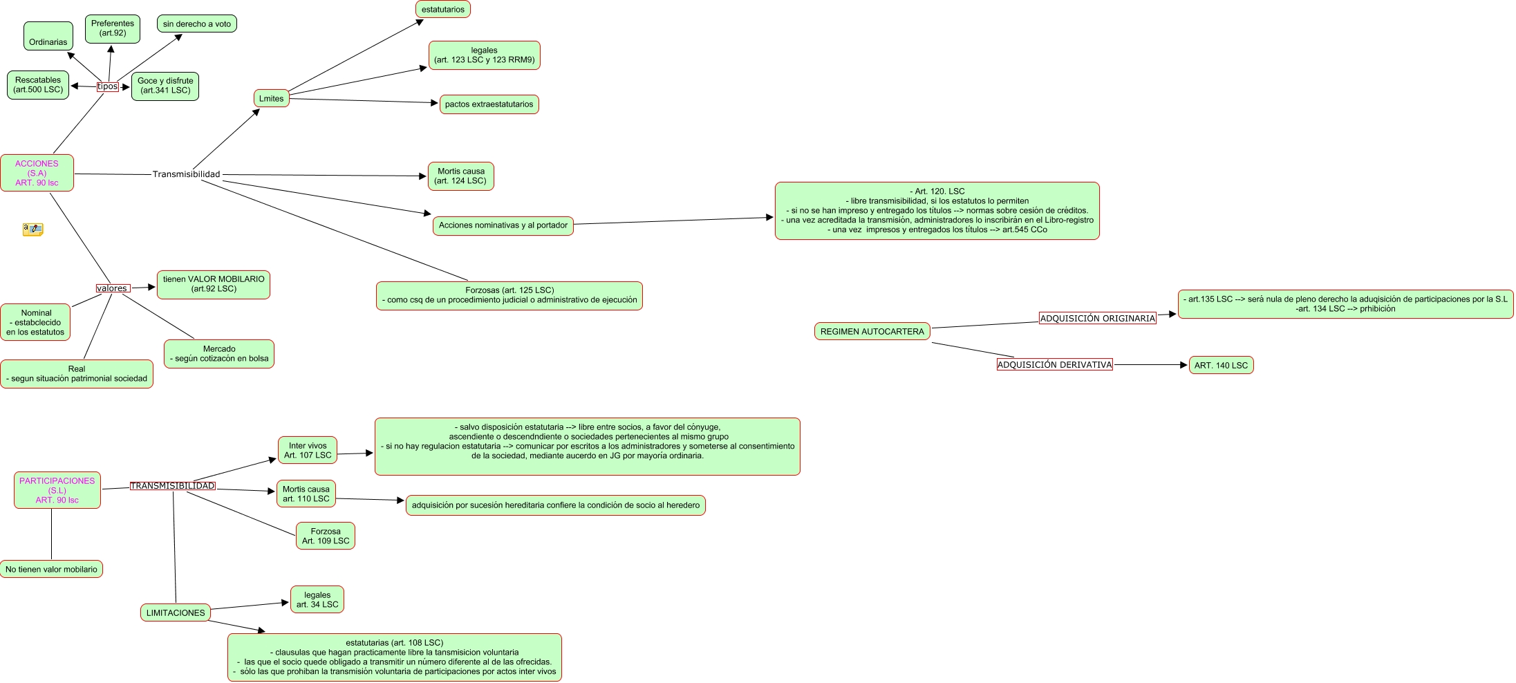Este Cmap, tiene información relacionada con: escenario nº7, ACCIONES (S.A) ART. 90 lsc tipos Rescatables (art.500 LSC), Lmites ???? estatutarios, ACCIONES (S.A) ART. 90 lsc Transmisibilidad Forzosas (art. 125 LSC) - como csq de un procedimiento judicial o administrativo de ejecución, ACCIONES (S.A) ART. 90 lsc tipos sin derecho a voto, LIMITACIONES ???? legales art. 34 LSC, ACCIONES (S.A) ART. 90 lsc valores tienen VALOR MOBILARIO (art.92 LSC), PARTICIPACIONES (S.L) ART. 90 lsc TRANSMISIBILIDAD Inter vivos Art. 107 LSC, Acciones nominativas y al portador ???? - Art. 120. LSC - libre transmisibilidad, si los estatutos lo permiten - si no se han impreso y entregado los títulos --> normas sobre cesión de créditos. - una vez acreditada la transmisión, administradores lo inscribirán en el Libro-registro - una vez impresos y entregados los títulos --> art.545 CCo, LIMITACIONES ???? estatutarias (art. 108 LSC) - clausulas que hagan practicamente libre la tansmisicion voluntaria - las que el socio quede obligado a transmitir un número diferente al de las ofrecidas. - sólo las que prohiban la transmisión voluntaria de participaciones por actos inter vivos, ACCIONES (S.A) ART. 90 lsc valores Nominal - estabclecido en los estatutos, ACCIONES (S.A) ART. 90 lsc valores Real - segun situación patrimonial sociedad, ACCIONES (S.A) ART. 90 lsc valores Mercado - según cotizacón en bolsa, REGIMEN AUTOCARTERA ADQUISICIÓN ORIGINARIA - art.135 LSC --> será nula de pleno derecho la aduqisición de participaciones por la S.L -art. 134 LSC --> prhibición, PARTICIPACIONES (S.L) ART. 90 lsc TRANSMISIBILIDAD Mortis causa art. 110 LSC, PARTICIPACIONES (S.L) ART. 90 lsc ???? No tienen valor mobilario, PARTICIPACIONES (S.L) ART. 90 lsc TRANSMISIBILIDAD LIMITACIONES, Mortis causa art. 110 LSC ???? adquisición por sucesión hereditaria confiere la condición de socio al heredero, ACCIONES (S.A) ART. 90 lsc Transmisibilidad Lmites, ACCIONES (S.A) ART. 90 lsc Transmisibilidad Mortis causa (art. 124 LSC), PARTICIPACIONES (S.L) ART. 90 lsc TRANSMISIBILIDAD Forzosa Art. 109 LSC