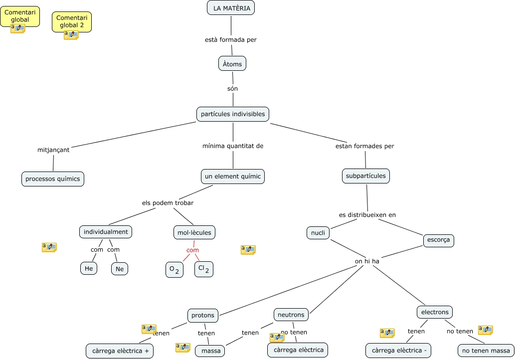Aquest mapa conceptual conté informació relacionada amb: organització materia, escorça on hi ha electrons, neutrons no tenen càrrega elèctrica, electrons no tenen no tenen massa, partícules indivisibles estan formades per subpartícules, mol·lècules com <math xmlns="http://www.w3.org/1998/Math/MathML"> <mrow> <mmultiscripts> <mtext> O </mtext> <mtext> 2 </mtext> <none/> </mmultiscripts> </mrow> </math>, nucli on hi ha neutrons, individualment com He, nucli on hi ha electrons, escorça on hi ha protons, nucli on hi ha protons, partícules indivisibles mínima quantitat de un element químic, un element químic els podem trobar mol·lècules, un element químic els podem trobar individualment, partícules indivisibles mitjançant processos químics, individualment com Ne, Àtoms són partícules indivisibles, escorça on hi ha neutrons, subpartícules es distribueixen en nucli, LA MATÈRIA està formada per Àtoms, subpartícules es distribueixen en escorça