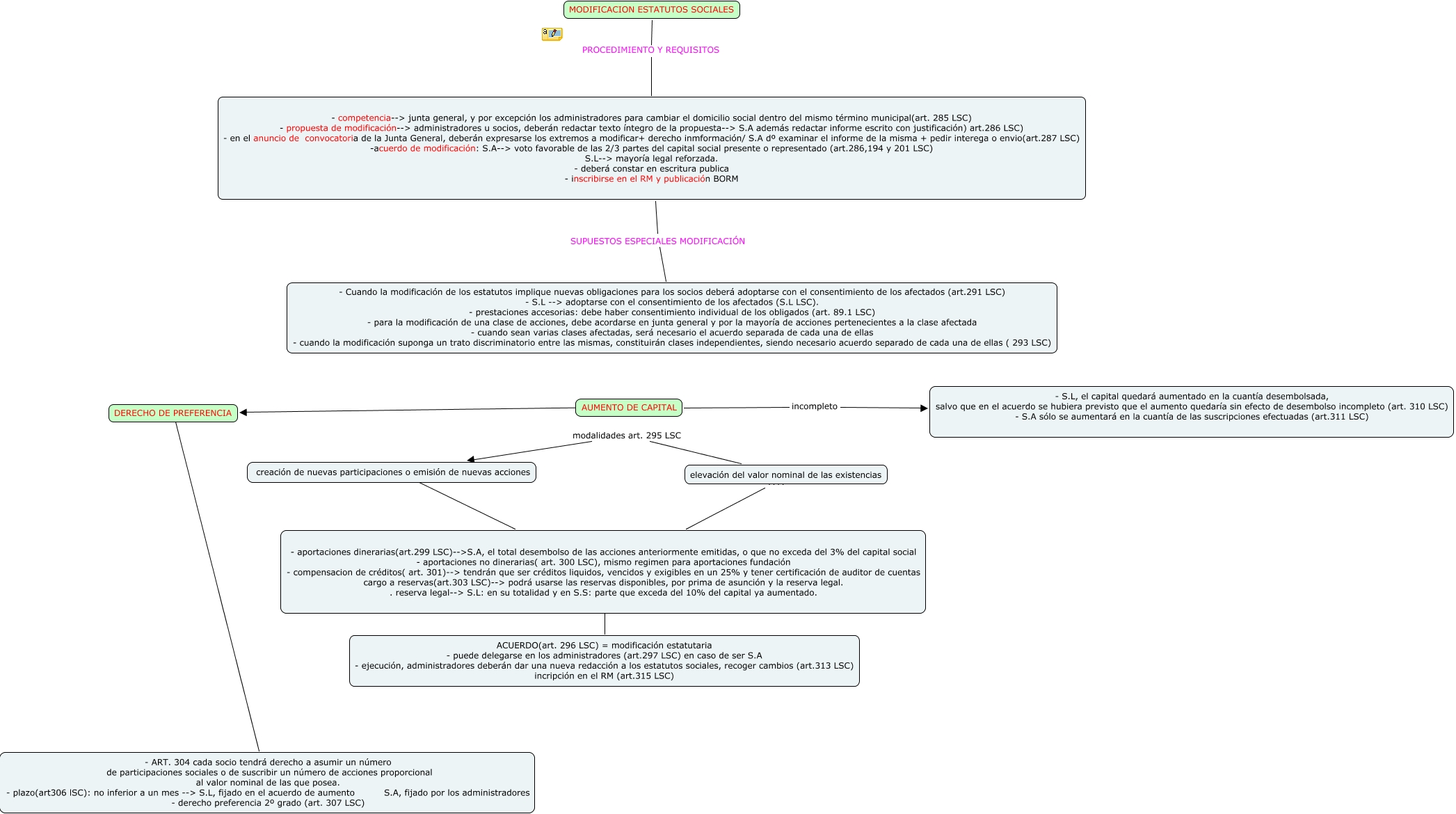 Este Cmap, tiene información relacionada con: escenario nº8, elevación del valor nominal de las existencias modalidades art. 295 LSC creación de nuevas participaciones o emisión de nuevas acciones, DERECHO DE PREFERENCIA ???? - ART. 304 cada socio tendrá derecho a asumir un número de participaciones sociales o de suscribir un número de acciones proporcional al valor nominal de las que posea. - plazo(art306 lSC): no inferior a un mes --> S.L, fijado en el acuerdo de aumento S.A, fijado por los administradores - derecho preferencia 2º grado (art. 307 LSC), - competencia--> junta general, y por excepción los administradores para cambiar el domicilio social dentro del mismo término municipal(art. 285 LSC) - propuesta de modificación--> administradores u socios, deberán redactar texto íntegro de la propuesta--> S.A además redactar informe escrito con justificación) art.286 LSC) - en el anuncio de convocatoria de la Junta General, deberán expresarse los extremos a modificar+ derecho inmformación/ S.A dº examinar el informe de la misma + pedir interega o envio(art.287 LSC) -acuerdo de modificación: S.A--> voto favorable de las 2/3 partes del capital social presente o representado (art.286,194 y 201 LSC) S.L--> mayoría legal reforzada. - deberá constar en escritura publica - inscribirse en el RM y publicación BORM SUPUESTOS ESPECIALES MODIFICACIÓN - Cuando la modificación de los estatutos implique nuevas obligaciones para los socios deberá adoptarse con el consentimiento de los afectados (art.291 LSC) - S.L --> adoptarse con el consentimiento de los afectados (S.L LSC). - prestaciones accesorias: debe haber consentimiento individual de los obligados (art. 89.1 LSC) - para la modificación de una clase de acciones, debe acordarse en junta general y por la mayoría de acciones pertenecientes a la clase afectada - cuando sean varias clases afectadas, será necesario el acuerdo separada de cada una de ellas - cuando la modificación suponga un trato discriminatorio entre las mismas, constituirán clases independientes, siendo necesario acuerdo separado de cada una de ellas ( 293 LSC), creación de nuevas participaciones o emisión de nuevas acciones ???? - aportaciones dinerarias(art.299 LSC)-->S.A, el total desembolso de las acciones anteriormente emitidas, o que no exceda del 3% del capital social - aportaciones no dinerarias( art. 300 LSC), mismo regimen para aportaciones fundación - compensacion de créditos( art. 301)--> tendrán que ser créditos liquidos, vencidos y exigibles en un 25% y tener certificación de auditor de cuentas cargo a reservas(art.303 LSC)--> podrá usarse las reservas disponibles, por prima de asunción y la reserva legal. . reserva legal--> S.L: en su totalidad y en S.S: parte que exceda del 10% del capital ya aumentado., AUMENTO DE CAPITAL ???? DERECHO DE PREFERENCIA, - aportaciones dinerarias(art.299 LSC)-->S.A, el total desembolso de las acciones anteriormente emitidas, o que no exceda del 3% del capital social - aportaciones no dinerarias( art. 300 LSC), mismo regimen para aportaciones fundación - compensacion de créditos( art. 301)--> tendrán que ser créditos liquidos, vencidos y exigibles en un 25% y tener certificación de auditor de cuentas cargo a reservas(art.303 LSC)--> podrá usarse las reservas disponibles, por prima de asunción y la reserva legal. . reserva legal--> S.L: en su totalidad y en S.S: parte que exceda del 10% del capital ya aumentado. ???? ACUERDO(art. 296 LSC) = modificación estatutaria - puede delegarse en los administradores (art.297 LSC) en caso de ser S.A - ejecución, administradores deberán dar una nueva redacción a los estatutos sociales, recoger cambios (art.313 LSC) incripción en el RM (art.315 LSC), AUMENTO DE CAPITAL incompleto - S.L, el capital quedará aumentado en la cuantía desembolsada, salvo que en el acuerdo se hubiera previsto que el aumento quedaría sin efecto de desembolso incompleto (art. 310 LSC) - S.A sólo se aumentará en la cuantía de las suscripciones efectuadas (art.311 LSC), MODIFICACION ESTATUTOS SOCIALES PROCEDIMIENTO Y REQUISITOS - competencia--> junta general, y por excepción los administradores para cambiar el domicilio social dentro del mismo término municipal(art. 285 LSC) - propuesta de modificación--> administradores u socios, deberán redactar texto íntegro de la propuesta--> S.A además redactar informe escrito con justificación) art.286 LSC) - en el anuncio de convocatoria de la Junta General, deberán expresarse los extremos a modificar+ derecho inmformación/ S.A dº examinar el informe de la misma + pedir interega o envio(art.287 LSC) -acuerdo de modificación: S.A--> voto favorable de las 2/3 partes del capital social presente o representado (art.286,194 y 201 LSC) S.L--> mayoría legal reforzada. - deberá constar en escritura publica - inscribirse en el RM y publicación BORM, elevación del valor nominal de las existencias ???? - aportaciones dinerarias(art.299 LSC)-->S.A, el total desembolso de las acciones anteriormente emitidas, o que no exceda del 3% del capital social - aportaciones no dinerarias( art. 300 LSC), mismo regimen para aportaciones fundación - compensacion de créditos( art. 301)--> tendrán que ser créditos liquidos, vencidos y exigibles en un 25% y tener certificación de auditor de cuentas cargo a reservas(art.303 LSC)--> podrá usarse las reservas disponibles, por prima de asunción y la reserva legal. . reserva legal--> S.L: en su totalidad y en S.S: parte que exceda del 10% del capital ya aumentado.