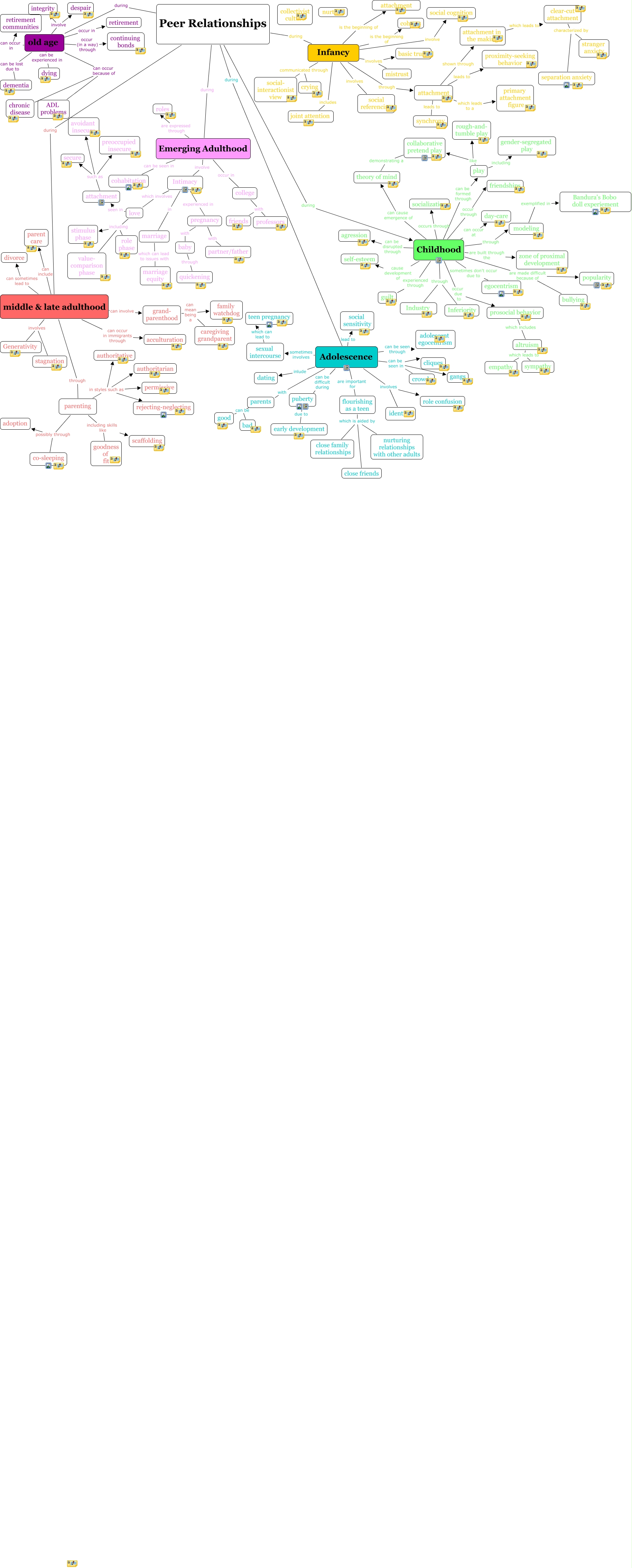 This Concept Map, created with IHMC CmapTools, has information related to: Hoekwater, Macy, Childhood can be disrupted through agression, flourishing as a teen which is aided by close friends, Peer Relationships during Emerging Adulthood, old age occur (in a way) through continuing bonds, Childhood through Industry, modeling exemplified in Bandura's Bobo doll experiement, Peer Relationships during middle & late adulthood, Childhood experienced through guilt, grand- parenthood can mean being a caregiving grandparent, parenting in styles such as authoritarian, pregnancy with partner/father, Emerging Adulthood can be seen in cohabitation, middle & late adulthood through parenting, old age occur in retirement, altruism which leads to sympathy, old age can occur because of ADL problems, Adolescence can be seen in crowds, Adolescence can be seen through adolescent egocentrism, Childhood occur due to prosocial behavior, prosocial behavior which includes altruism