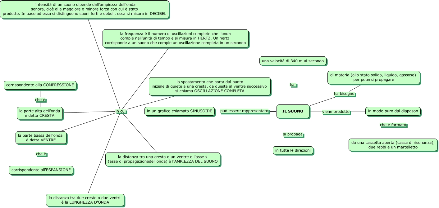 Questa Cmap, creata con IHMC CmapTools, contiene informazioni relative a: Il suono, in un grafico chiamato SINUSOIDE in cui la parte alta dell'onda è detta CRESTA, IL SUONO ha bisogno di materia (allo stato solido, liquido, gassoso) per potersi propagare, IL SUONO può essere rappresentato in un grafico chiamato SINUSOIDE, la parte alta dell'onda è detta CRESTA che è corrispondente alla COMPRESSIONE, in un grafico chiamato SINUSOIDE in cui la frequenza è il numero di oscillazioni complete che l'onda compie nell'unità di tempo e si misura in HERTZ. Un hertz corrisponde a un suono che compie un oscillazione completa in un secondo, in modo puro dal diapason che è formato da una cassetta aperta (cassa di risonanza), due rebbi e un martelletto, IL SUONO si propaga in tutte le direzioni, in un grafico chiamato SINUSOIDE in cui lo spostamento che porta dal punto iniziale di quiete a una cresta, da questa al ventre successivo si chiama OSCILLAZIONE COMPLETA, in un grafico chiamato SINUSOIDE in cui la parte bassa dell'onda è detta VENTRE, in un grafico chiamato SINUSOIDE in cui la distanza tra due creste o due ventri è la LUNGHEZZA D'ONDA, IL SUONO ha una velocità di 340 m al secondo, in un grafico chiamato SINUSOIDE in cui la distanza tra una cresta o un ventre e l'asse x (asse di propagazionedell'onda) è l'AMPIEZZA DEL SUONO, la parte bassa dell'onda è detta VENTRE che è corrispondente all'ESPANSIONE, in un grafico chiamato SINUSOIDE in cui l'intensità di un suono dipende dall'ampiezza dell'onda sonora, cioè alla maggiore o minore forza con cui è stato prodotto. In base ad essa si distinguono suoni forti e deboli, essa si misura in DECIBEL, IL SUONO viene prodotto in modo puro dal diapason