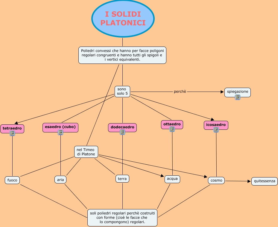 Questa Cmap, creata con IHMC CmapTools, contiene informazioni relative a: I solidi platonici, sono solo 5 ottaedro, Poliedri convessi che hanno per facce poligoni regolari congruenti e hanno tutti gli spigoli e i vertici equivalenti. sono solo 5, nel Timeo di Platone aria, Poliedri convessi che hanno per facce poligoni regolari congruenti e hanno tutti gli spigoli e i vertici equivalenti. nel Timeo di Platone, tetraedro fuoco, ottaedro acqua, nel Timeo di Platone cosmo, sono solo 5 esaedro (cubo), I SOLIDI PLATONICI Poliedri convessi che hanno per facce poligoni regolari congruenti e hanno tutti gli spigoli e i vertici equivalenti., fuoco soli poliedri regolari perchè costruiti con forme (cioè le facce che lo compongono) regolari., aria soli poliedri regolari perchè costruiti con forme (cioè le facce che lo compongono) regolari., nel Timeo di Platone terra, cosmo quitessenza, icosaedro cosmo, nel Timeo di Platone acqua, cosmo soli poliedri regolari perchè costruiti con forme (cioè le facce che lo compongono) regolari., acqua soli poliedri regolari perchè costruiti con forme (cioè le facce che lo compongono) regolari., nel Timeo di Platone fuoco, sono solo 5 icosaedro, sono solo 5 perchè spiegazione