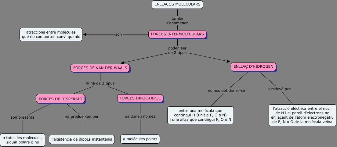 Aquest mapa conceptual conté informació relacionada amb: TASCA 4 - FORCES INTERMOLECULARS, FORCES DE DISPERSIÓ són presents a totes les molècules, siguin polars o no, ENLLAÇ D'HIDROGEN només pot donar-se entre una molècula que contingui H (unit a F, O o N) i una altra que contingui F, O o N, FORCES DE DISPERSIÓ es produeixen per l'existència de dipoLs instantanis, FORCES INTERMOLECULARS són atraccions entre molècules que no comporten canvi químic, ENLLAÇOS MOLECULARS també s'anomenen FORCES INTERMOLECULARS, FORCES INTERMOLECULARS poden ser de 2 tipus ENLLAÇ D'HIDROGEN, FORCES DIPOL-DIPOL es donen només a molécules polars, FORCES DE VAN DER WAALS hi ha de 2 tipus FORCES DIPOL-DIPOL, ENLLAÇ D'HIDROGEN s'esdevé per l'atracció elèctrica entre el nucli de H i el parell d'electrons no enllaçant de l'átom electronegatiu de F, N o O de la molècula veïna, FORCES DE VAN DER WAALS hi ha de 2 tipus FORCES DE DISPERSIÓ, FORCES INTERMOLECULARS poden ser de 2 tipus FORCES DE VAN DER WAALS
