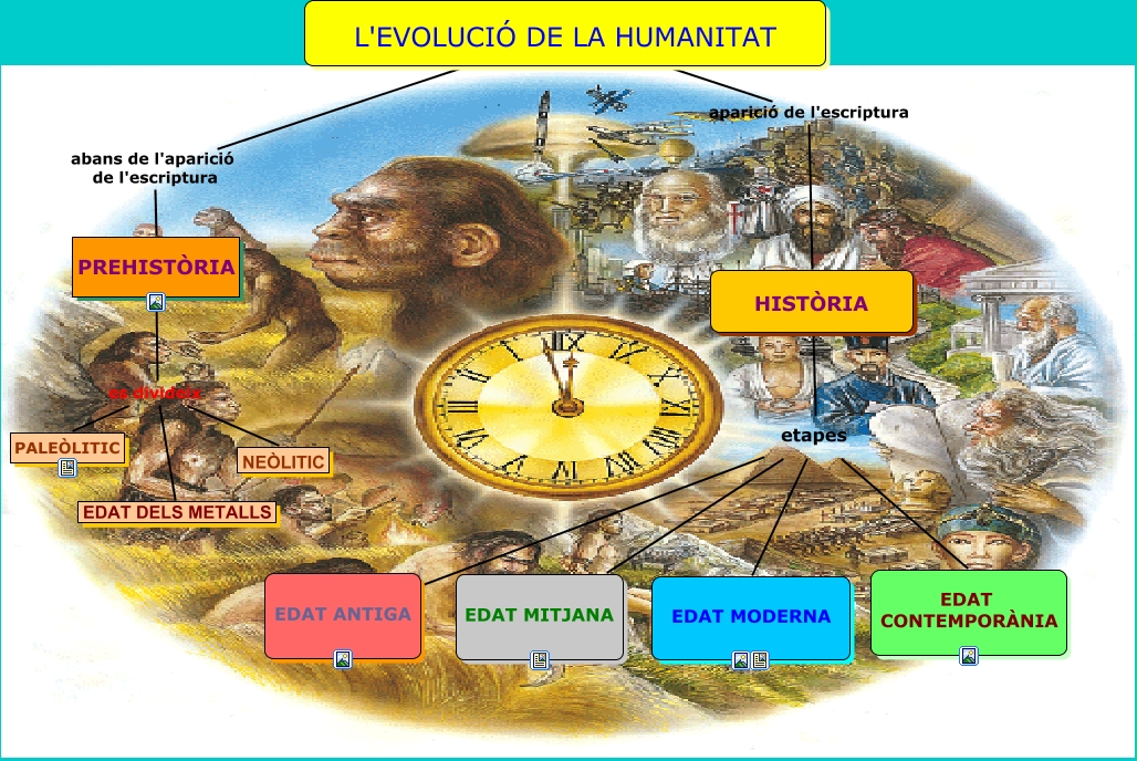 Aquest mapa conceptual conté informació relacionada amb: l'evolució de la humanitat, PREHISTÒRIA es divideix NEÒLITIC, L'EVOLUCIÓ DE LA HUMANITAT aparició de l'escriptura HISTÒRIA, HISTÒRIA etapes EDAT ANTIGA, L'EVOLUCIÓ DE LA HUMANITAT abans de l'aparició de l'escriptura PREHISTÒRIA, HISTÒRIA etapes EDAT MODERNA, PREHISTÒRIA es divideix PALEÒLITIC, HISTÒRIA etapes EDAT CONTEMPORÀNIA, PREHISTÒRIA es divideix EDAT DELS METALLS, HISTÒRIA etapes EDAT MITJANA