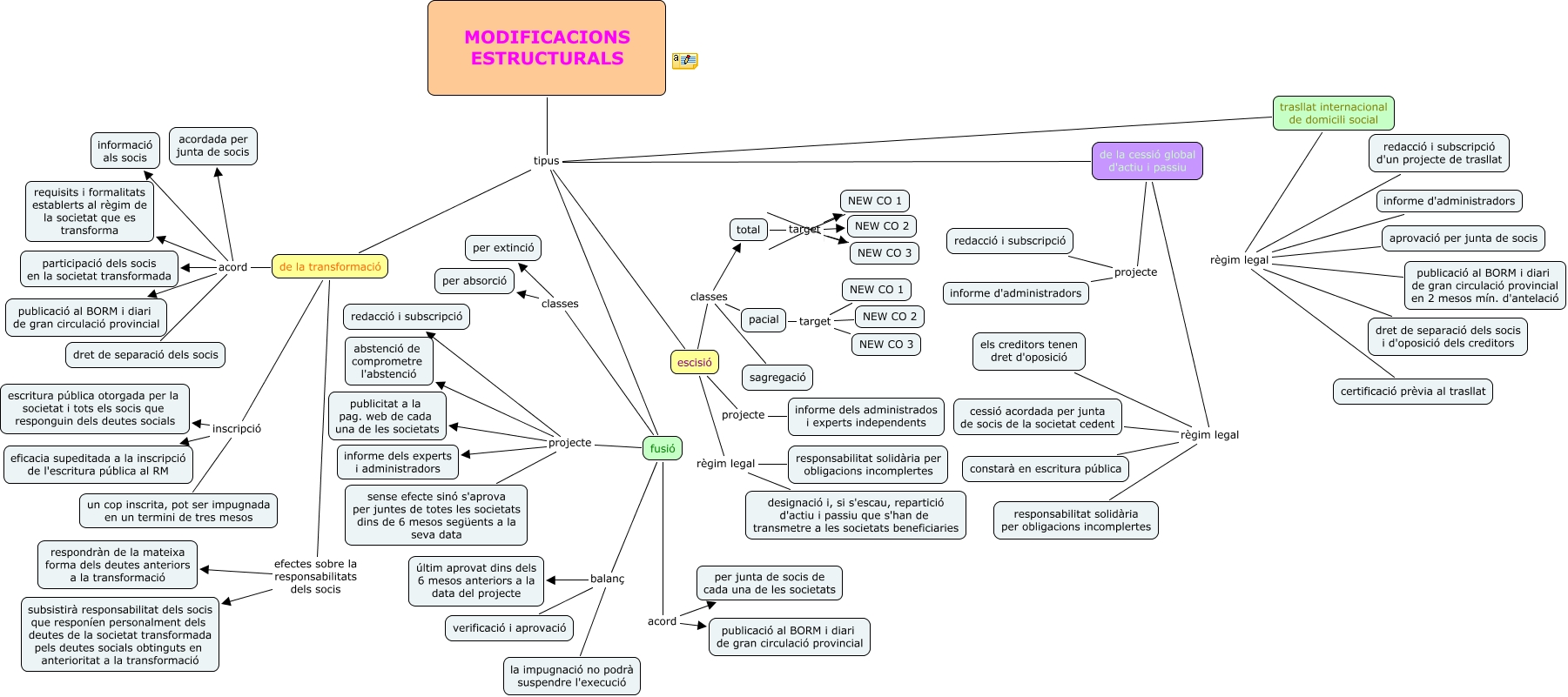 Este Cmap, tiene información relacionada con: Mapa conceptual 10, pacial target NEW CO 1, de la transformació inscripció un cop inscrita, pot ser impugnada en un termini de tres mesos, total target NEW CO 3, MODIFICACIONS ESTRUCTURALS tipus fusió, trasllat internacional de domicili social règim legal informe d'administradors, fusió acord per junta de socis de cada una de les societats, fusió balanç la impugnació no podrà suspendre l'execució, escisió classes sagregació, NEW CO 1, MODIFICACIONS ESTRUCTURALS tipus de la transformació, pacial target NEW CO 2, fusió projecte redacció i subscripció, fusió classes per extinció, de la transformació acord requisits i formalitats establerts al règim de la societat que es transforma, escisió règim legal responsabilitat solidària per obligacions incomplertes, fusió projecte sense efecte sinó s'aprova per juntes de totes les societats dins de 6 mesos següents a la seva data, de la cessió global d'actiu i passiu règim legal constarà en escritura pública, MODIFICACIONS ESTRUCTURALS tipus trasllat internacional de domicili social, escisió classes total, fusió projecte publicitat a la pag. web de cada una de les societats