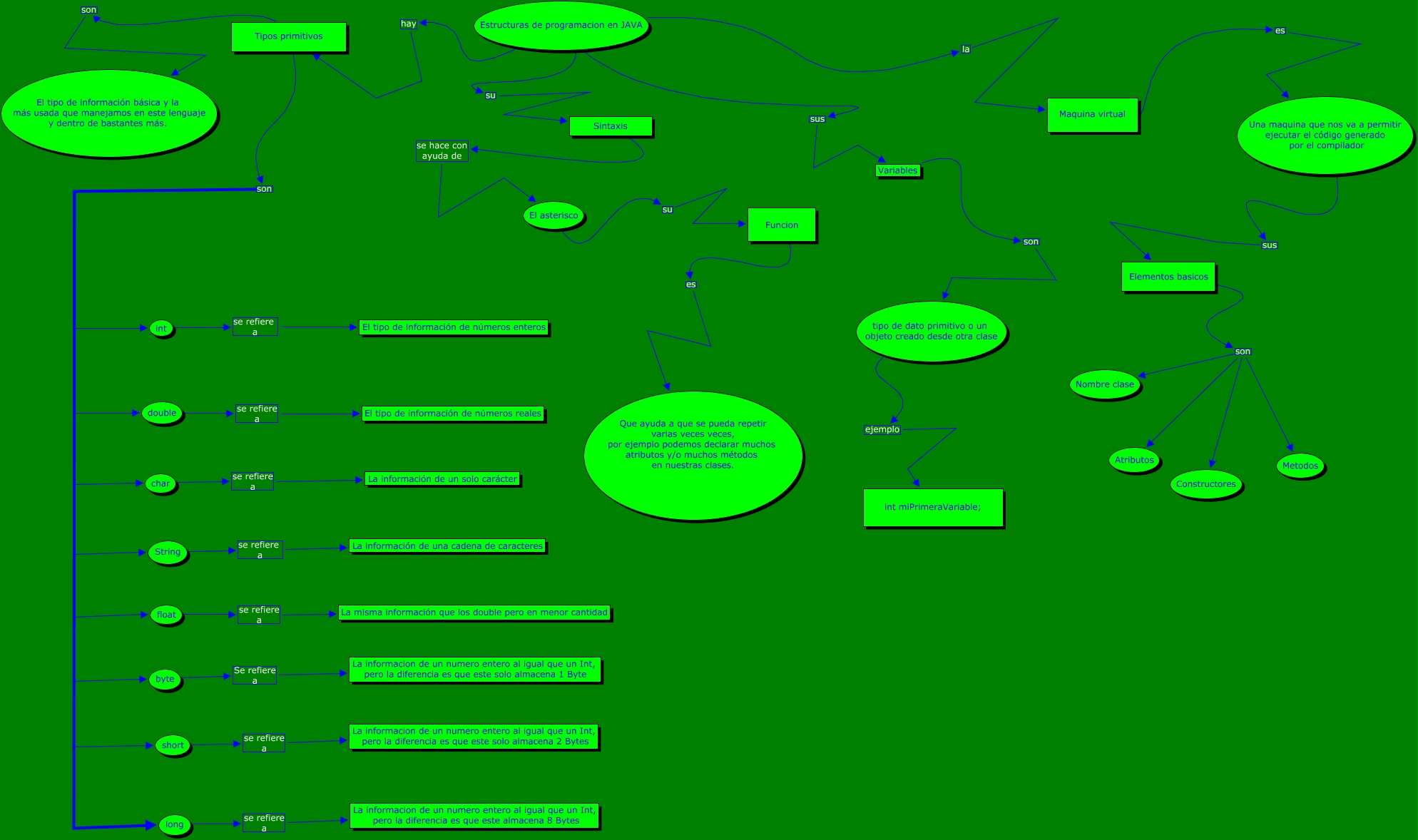 Este Cmap, tiene información relacionada con: Julian Carpintero 092, Una maquina que nos va a permitir ejecutar el código generado por el compilador sus Elementos basicos, Maquina virtual es Una maquina que nos va a permitir ejecutar el código generado por el compilador, Elementos basicos son Atributos, Tipos primitivos son short, Tipos primitivos son El tipo de información básica y la más usada que manejamos en este lenguaje y dentro de bastantes más., Elementos basicos son Constructores, float se refiere a La misma información que los double pero en menor cantidad, Sintaxis se hace con ayuda de El asterisco, El asterisco su Funcion, Elementos basicos son Metodos, Elementos basicos son Nombre clase, tipo de dato primitivo o un objeto creado desde otra clase ejemplo int miPrimeraVariable;, char se refiere a La información de un solo carácter, double se refiere a El tipo de información de números reales, Tipos primitivos son byte, Tipos primitivos son char, Estructuras de programacion en JAVA su Sintaxis, Estructuras de programacion en JAVA sus Variables, Estructuras de programacion en JAVA hay Tipos primitivos, long se refiere a La informacion de un numero entero al igual que un Int, pero la diferencia es que este almacena 8 Bytes