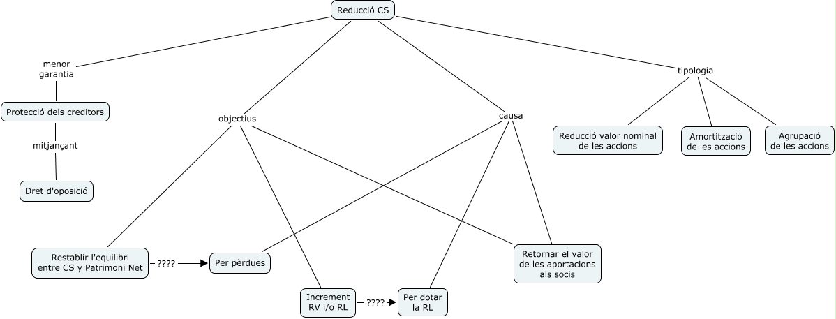 Este Cmap, tiene información relacionada con: Escenari 10, Restablir l'equilibri entre CS y Patrimoni Net ???? Per pèrdues, Reducció CS tipologia Amortització de les accions, Reducció CS causa Retornar el valor de les aportacions als socis, Reducció CS objectius Retornar el valor de les aportacions als socis, Reducció CS causa Per dotar la RL, Reducció CS tipologia Reducció valor nominal de les accions, Protecció dels creditors mitjançant Dret d'oposició, Reducció CS objectius Increment RV i/o RL, Reducció CS objectius Restablir l'equilibri entre CS y Patrimoni Net, Reducció CS causa Per pèrdues, Reducció CS tipologia Agrupació de les accions, Increment RV i/o RL ???? Per dotar la RL, Reducció CS menor garantia Protecció dels creditors