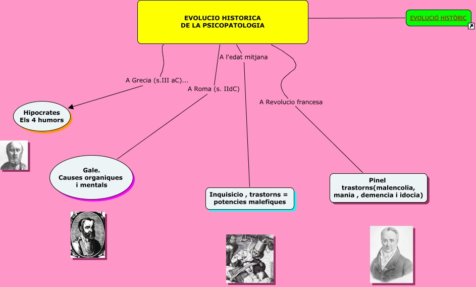 Aquest mapa conceptual conté informació relacionada amb: Evolució històrica-, EVOLUCIÓ HISTÒRIC ???? EVOLUCIO HISTORICA DE LA PSICOPATOLOGIA, EVOLUCIO HISTORICA DE LA PSICOPATOLOGIA A Roma (s. IIdC) Gale. Causes organiques i mentals, EVOLUCIO HISTORICA DE LA PSICOPATOLOGIA A l'edat mitjana Inquisicio , trastorns = potencies malefiques, EVOLUCIO HISTORICA DE LA PSICOPATOLOGIA A Grecia (s.III aC)... Hipocrates Els 4 humors, EVOLUCIO HISTORICA DE LA PSICOPATOLOGIA A Revolucio francesa Pinel trastorns(malencolia, mania , demencia i idocia)