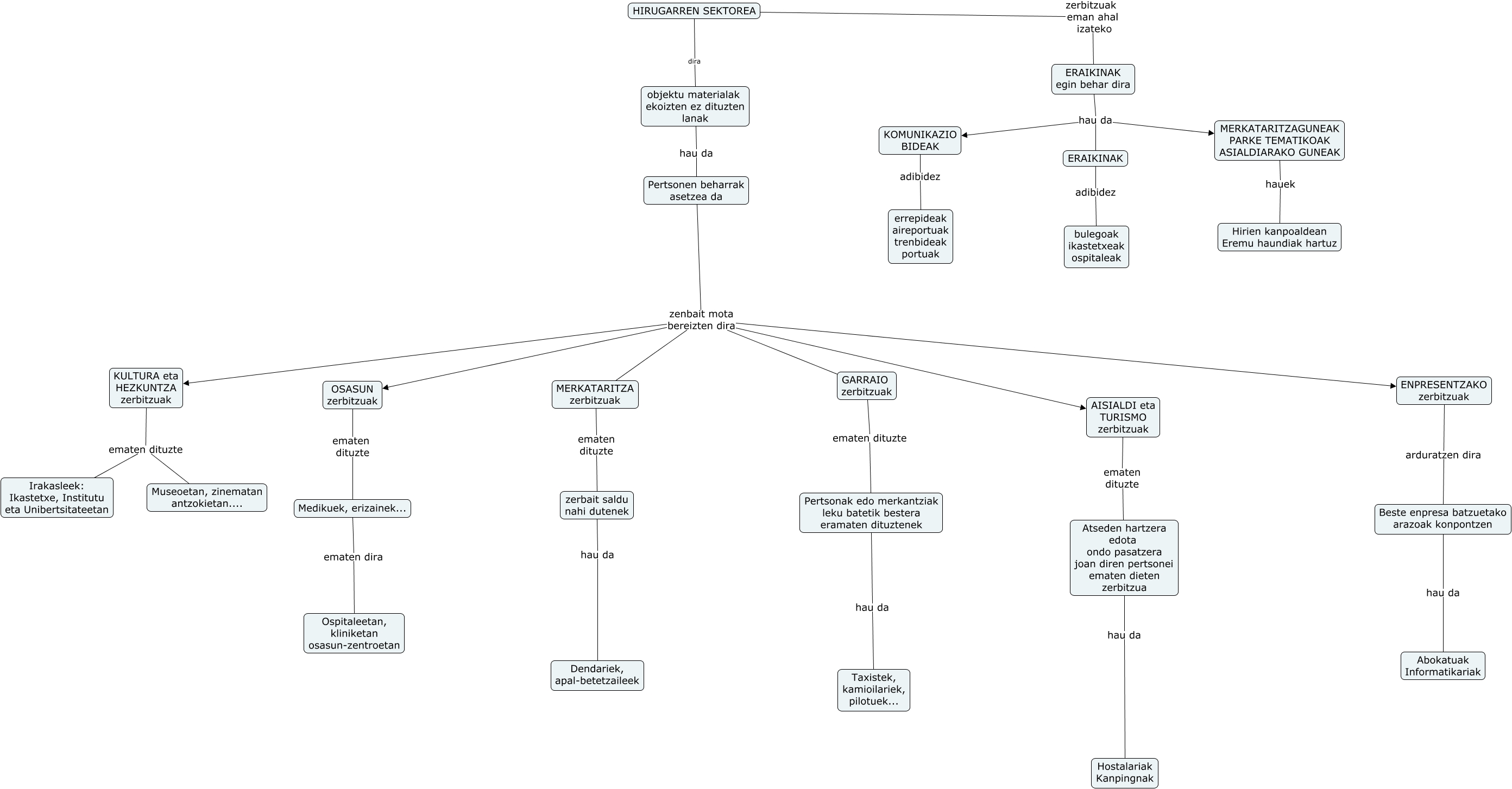 Este Cmap, tiene información relacionada con: Lanak, Hirugarren sektorea, ERAIKINAK egin behar dira hau da MERKATARITZAGUNEAK PARKE TEMATIKOAK ASIALDIARAKO GUNEAK, OSASUN zerbitzuak ematen dituzte Medikuek, erizainek..., Pertsonen beharrak asetzea da zenbait mota bereizten dira MERKATARITZA zerbitzuak, ERAIKINAK egin behar dira hau da ERAIKINAK, Pertsonak edo merkantziak leku batetik bestera eramaten dituztenek hau da Taxistek, kamioilariek, pilotuek..., HIRUGARREN SEKTOREA dira objektu materialak ekoizten ez dituzten lanak, Pertsonen beharrak asetzea da zenbait mota bereizten dira KULTURA eta HEZKUNTZA zerbitzuak, objektu materialak ekoizten ez dituzten lanak hau da Pertsonen beharrak asetzea da, HIRUGARREN SEKTOREA zerbitzuak eman ahal izateko ERAIKINAK egin behar dira, Pertsonen beharrak asetzea da zenbait mota bereizten dira ENPRESENTZAKO zerbitzuak, MERKATARITZA zerbitzuak ematen dituzte zerbait saldu nahi dutenek, KULTURA eta HEZKUNTZA zerbitzuak ematen dituzte Irakasleek: Ikastetxe, Institutu eta Unibertsitateetan, Beste enpresa batzuetako arazoak konpontzen hau da Abokatuak Informatikariak, KULTURA eta HEZKUNTZA zerbitzuak ematen dituzte Museoetan, zinematan antzokietan...., KOMUNIKAZIO BIDEAK adibidez errepideak aireportuak trenbideak portuak, Pertsonen beharrak asetzea da zenbait mota bereizten dira AISIALDI eta TURISMO zerbitzuak, ERAIKINAK egin behar dira hau da KOMUNIKAZIO BIDEAK, AISIALDI eta TURISMO zerbitzuak ematen dituzte Atseden hartzera edota ondo pasatzera joan diren pertsonei ematen dieten zerbitzua, Atseden hartzera edota ondo pasatzera joan diren pertsonei ematen dieten zerbitzua hau da Hostalariak Kanpingnak, ERAIKINAK adibidez bulegoak ikastetxeak ospitaleak