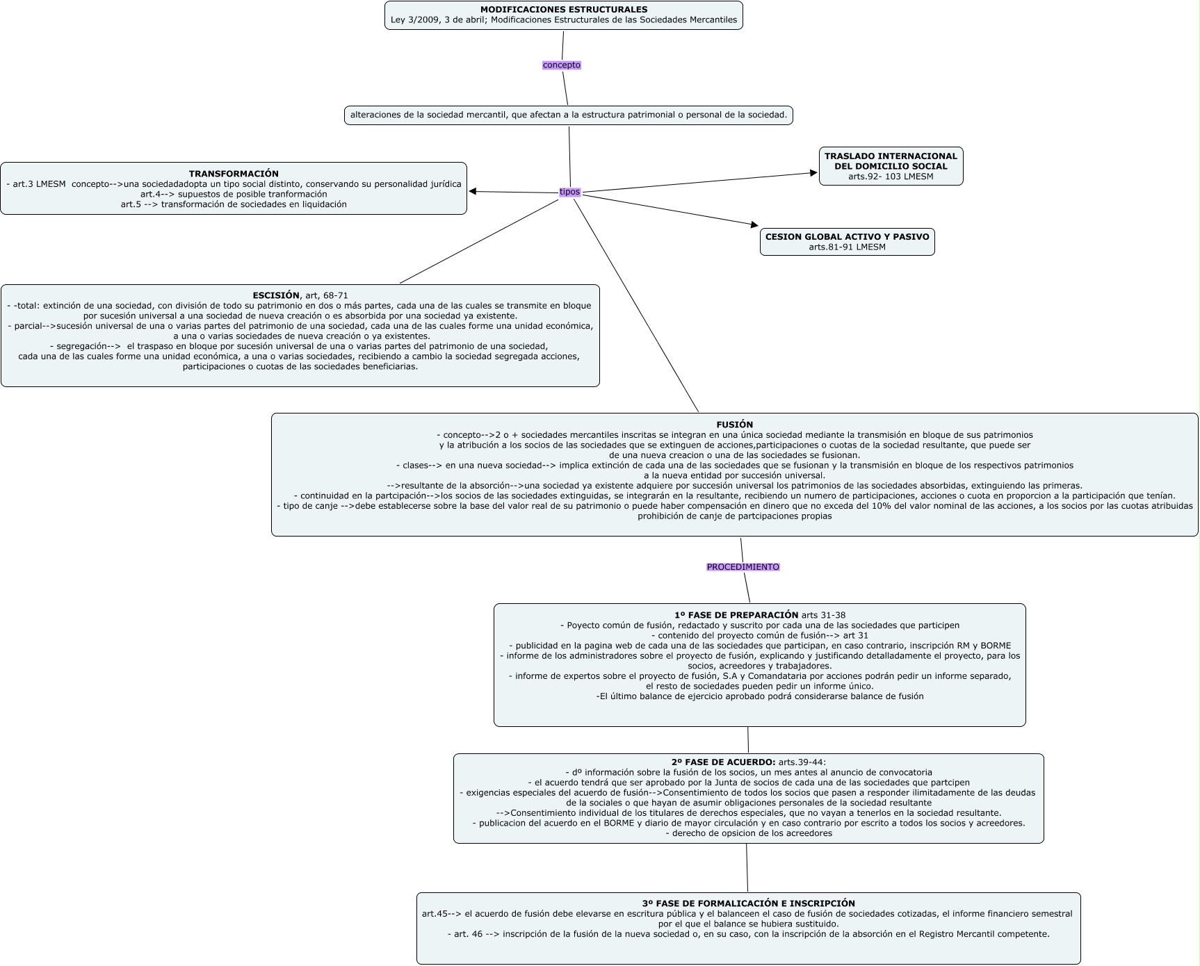 Este Cmap, tiene información relacionada con: escenario nº10, 2º FASE DE ACUERDO: arts.39-44: - dº información sobre la fusión de los socios, un mes antes al anuncio de convocatoria - el acuerdo tendrá que ser aprobado por la Junta de socios de cada una de las sociedades que partcipen - exigencias especiales del acuerdo de fusión-->Consentimiento de todos los socios que pasen a responder ilimitadamente de las deudas de la sociales o que hayan de asumir obligaciones personales de la sociedad resultante -->Consentimiento individual de los titulares de derechos especiales, que no vayan a tenerlos en la sociedad resultante. - publicacion del acuerdo en el BORME y diario de mayor circulación y en caso contrario por escrito a todos los socios y acreedores. - derecho de opsicion de los acreedores ???? 3º FASE DE FORMALICACIÓN E INSCRIPCIÓN art.45--> el acuerdo de fusión debe elevarse en escritura pública y el balanceen el caso de fusión de sociedades cotizadas, el informe financiero semestral por el que el balance se hubiera sustituido. - art. 46 --> inscripción de la fusión de la nueva sociedad o, en su caso, con la inscripción de la absorción en el Registro Mercantil competente., alteraciones de la sociedad mercantil, que afectan a la estructura patrimonial o personal de la sociedad. tipos FUSIÓN - concepto--ɮ o + sociedades mercantiles inscritas se integran en una única sociedad mediante la transmisión en bloque de sus patrimonios y la atribución a los socios de las sociedades que se extinguen de acciones,participaciones o cuotas de la sociedad resultante, que puede ser de una nueva creacion o una de las sociedades se fusionan. - clases--> en una nueva sociedad--> implica extinción de cada una de las sociedades que se fusionan y la transmisión en bloque de los respectivos patrimonios a la nueva entidad por succesión universal. -->resultante de la absorción-->una sociedad ya existente adquiere por succesión universal los patrimonios de las sociedades absorbidas, extinguiendo las primeras. - continuidad en la partcipación-->los socios de las sociedades extinguidas, se integrarán en la resultante, recibiendo un numero de participaciones, acciones o cuota en proporcion a la participación que tenían. - tipo de canje -->debe establecerse sobre la base del valor real de su patrimonio o puede haber compensación en dinero que no exceda del 10% del valor nominal de las acciones, a los socios por las cuotas atribuidas prohibición de canje de partcipaciones propias, alteraciones de la sociedad mercantil, que afectan a la estructura patrimonial o personal de la sociedad. tipos TRANSFORMACIÓN - art.3 LMESM concepto-->una sociedadadopta un tipo social distinto, conservando su personalidad jurídica art.4--> supuestos de posible tranformación art.5 --> transformación de sociedades en liquidación, 1º FASE DE PREPARACIÓN arts 31-38 - Poyecto común de fusión, redactado y suscrito por cada una de las sociedades que participen - contenido del proyecto común de fusión--> art 31 - publicidad en la pagina web de cada una de las sociedades que participan, en caso contrario, inscripción RM y BORME - informe de los administradores sobre el proyecto de fusión, explicando y justificando detalladamente el proyecto, para los socios, acreedores y trabajadores. - informe de expertos sobre el proyecto de fusión, S.A y Comandataria por acciones podrán pedir un informe separado, el resto de sociedades pueden pedir un informe único. -El último balance de ejercicio aprobado podrá considerarse balance de fusión ???? 2º FASE DE ACUERDO: arts.39-44: - dº información sobre la fusión de los socios, un mes antes al anuncio de convocatoria - el acuerdo tendrá que ser aprobado por la Junta de socios de cada una de las sociedades que partcipen - exigencias especiales del acuerdo de fusión-->Consentimiento de todos los socios que pasen a responder ilimitadamente de las deudas de la sociales o que hayan de asumir obligaciones personales de la sociedad resultante -->Consentimiento individual de los titulares de derechos especiales, que no vayan a tenerlos en la sociedad resultante. - publicacion del acuerdo en el BORME y diario de mayor circulación y en caso contrario por escrito a todos los socios y acreedores. - derecho de opsicion de los acreedores, alteraciones de la sociedad mercantil, que afectan a la estructura patrimonial o personal de la sociedad. tipos ESCISIÓN, art, 68-71 - -total: extinción de una sociedad, con división de todo su patrimonio en dos o más partes, cada una de las cuales se transmite en bloque por sucesión universal a una sociedad de nueva creación o es absorbida por una sociedad ya existente. - parcial-->sucesión universal de una o varias partes del patrimonio de una sociedad, cada una de las cuales forme una unidad económica, a una o varias sociedades de nueva creación o ya existentes. - segregación--> el traspaso en bloque por sucesión universal de una o varias partes del patrimonio de una sociedad, cada una de las cuales forme una unidad económica, a una o varias sociedades, recibiendo a cambio la sociedad segregada acciones, participaciones o cuotas de las sociedades beneficiarias., alteraciones de la sociedad mercantil, que afectan a la estructura patrimonial o personal de la sociedad. tipos TRASLADO INTERNACIONAL DEL DOMICILIO SOCIAL arts.92- 103 LMESM, FUSIÓN - concepto--ɮ o + sociedades mercantiles inscritas se integran en una única sociedad mediante la transmisión en bloque de sus patrimonios y la atribución a los socios de las sociedades que se extinguen de acciones,participaciones o cuotas de la sociedad resultante, que puede ser de una nueva creacion o una de las sociedades se fusionan. - clases--> en una nueva sociedad--> implica extinción de cada una de las sociedades que se fusionan y la transmisión en bloque de los respectivos patrimonios a la nueva entidad por succesión universal. -->resultante de la absorción-->una s