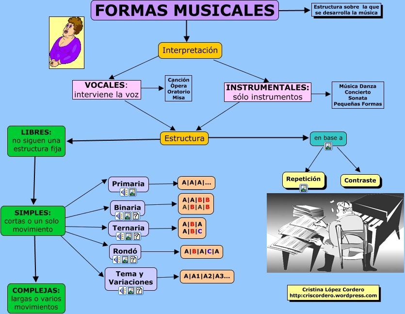 Este Cmap, tiene información relacionada con: Fomas musicales, Primaria ???? ????, Binaria ???? A|A|B|B A|B|A|B, SIMPLES: cortas o un solo movimiento ???? Ternaria, Tema y Variaciones ???? A|A1|A2|A3..., VOCALES: interviene la voz ???? Canción Ópera Oratorio Misa, SIMPLES: cortas o un solo movimiento ???? Binaria, Interpretación ???? INSTRUMENTALES: sólo instrumentos, Rondó ???? A|B|A|C|A, Estructura ???? LIBRES: no siguen una estructura fija, Interpretación ???? VOCALES: interviene la voz, en base a ???? Contraste, Ternaria ???? A|B|A A|B|C, Estructura ???? en base a, VOCALES: interviene la voz ???? Estructura, FORMAS MUSICALES ???? Estructura sobre la que se desarrolla la música, SIMPLES: cortas o un solo movimiento ???? Tema y Variaciones, SIMPLES: cortas o un solo movimiento ???? Rondó, INSTRUMENTALES: sólo instrumentos ???? Estructura, FORMAS MUSICALES ???? ????, INSTRUMENTALES: sólo instrumentos ???? Música Danza Concierto Sonata Pequeñas Formas