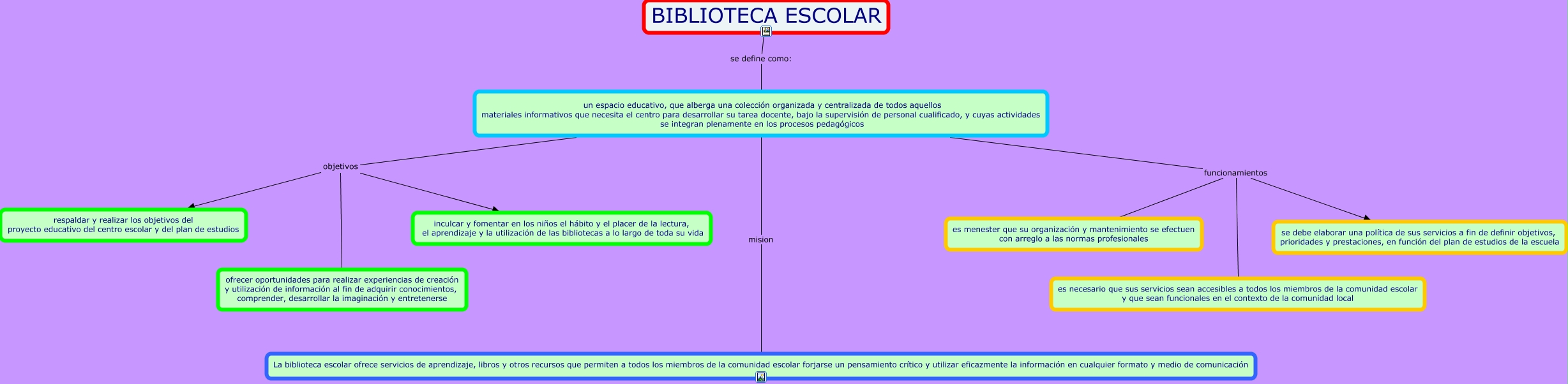 Este Cmap, tiene información relacionada con: BIBLIOTECA ESCOLAR, un espacio educativo, que alberga una colección organizada y centralizada de todos aquellos materiales informativos que necesita el centro para desarrollar su tarea docente, bajo la supervisión de personal cualificado, y cuyas actividades se integran plenamente en los procesos pedagógicos funcionamientos es menester que su organización y mantenimiento se efectuen con arreglo a las normas profesionales, BIBLIOTECA ESCOLAR se define como: un espacio educativo, que alberga una colección organizada y centralizada de todos aquellos materiales informativos que necesita el centro para desarrollar su tarea docente, bajo la supervisión de personal cualificado, y cuyas actividades se integran plenamente en los procesos pedagógicos, un espacio educativo, que alberga una colección organizada y centralizada de todos aquellos materiales informativos que necesita el centro para desarrollar su tarea docente, bajo la supervisión de personal cualificado, y cuyas actividades se integran plenamente en los procesos pedagógicos funcionamientos se debe elaborar una política de sus servicios a fin de definir objetivos, prioridades y prestaciones, en función del plan de estudios de la escuela, un espacio educativo, que alberga una colección organizada y centralizada de todos aquellos materiales informativos que necesita el centro para desarrollar su tarea docente, bajo la supervisión de personal cualificado, y cuyas actividades se integran plenamente en los procesos pedagógicos funcionamientos es necesario que sus servicios sean accesibles a todos los miembros de la comunidad escolar y que sean funcionales en el contexto de la comunidad local, un espacio educativo, que alberga una colección organizada y centralizada de todos aquellos materiales informativos que necesita el centro para desarrollar su tarea docente, bajo la supervisión de personal cualificado, y cuyas actividades se integran plenamente en los procesos pedagógicos objetivos respaldar y realizar los objetivos del proyecto educativo del centro escolar y del plan de estudios, un espacio educativo, que alberga una colección organizada y centralizada de todos aquellos materiales informativos que necesita el centro para desarrollar su tarea docente, bajo la supervisión de personal cualificado, y cuyas actividades se integran plenamente en los procesos pedagógicos mision La biblioteca escolar ofrece servicios de aprendizaje, libros y otros recursos que permiten a todos los miembros de la comunidad escolar forjarse un pensamiento crítico y utilizar eficazmente la información en cualquier formato y medio de comunicación, un espacio educativo, que alberga una colección organizada y centralizada de todos aquellos materiales informativos que necesita el centro para desarrollar su tarea docente, bajo la supervisión de personal cualificado, y cuyas actividades se integran plenamente en los procesos pedagógicos objetivos ofrecer oportunidades para realizar experiencias de creación y utilización de información al fin de adquirir conocimientos, comprender, desarrollar la imaginación y entretenerse, un espacio educativo, que alberga una colección organizada y centralizada de todos aquellos materiales informativos que necesita el centro para desarrollar su tarea docente, bajo la supervisión de personal cualificado, y cuyas actividades se integran plenamente en los procesos pedagógicos objetivos inculcar y fomentar en los niños el hábito y el placer de la lectura, el aprendizaje y la utilización de las bibliotecas a lo largo de toda su vida