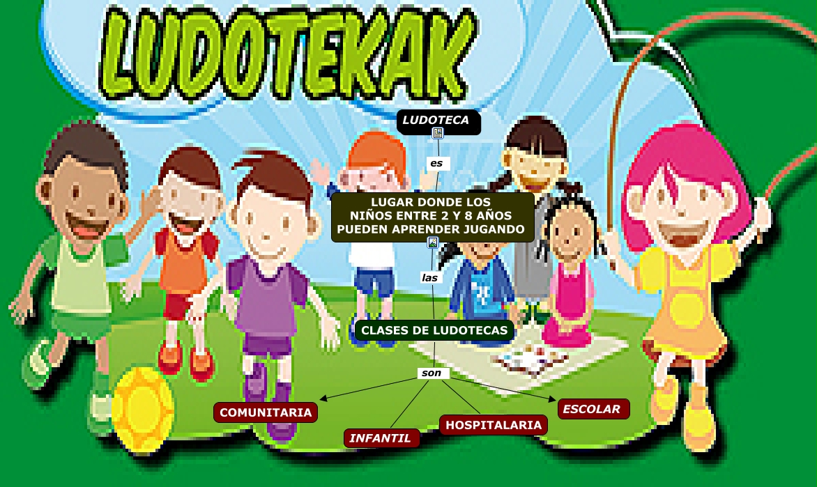 Este Cmap, tiene información relacionada con: ludoteca, CLASES DE LUDOTECAS son INFANTIL, CLASES DE LUDOTECAS son ESCOLAR, LUDOTECA es LUGAR DONDE LOS NIÑOS ENTRE 2 Y 8 AÑOS PUEDEN APRENDER JUGANDO, CLASES DE LUDOTECAS son HOSPITALARIA, LUGAR DONDE LOS NIÑOS ENTRE 2 Y 8 AÑOS PUEDEN APRENDER JUGANDO las CLASES DE LUDOTECAS, CLASES DE LUDOTECAS son COMUNITARIA